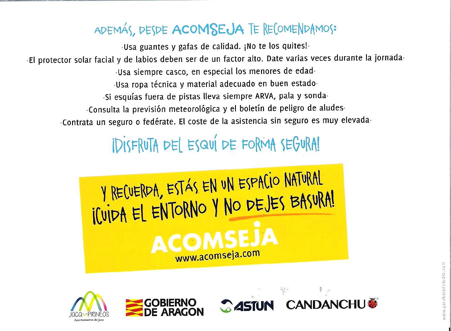 La campaña consiste en la difusión de 1.500 carteles y 3.000 dípticos en los establecimientos de la zona, a través de la Oficina de Turismo de Jaca, las estaciones de esquí de Astún y Candanchú, el Ayuntamiento de la ciudad y los centros educativos de la comarca. En ellos, a través de un sarrio blanco y con un diseño de Saúl M. Irigaray, se recoge el decálogo FIS de una forma llamativa y concisa, para lograr concienciar de la necesidad de practicarlo. El diseño evoca los lugares más emblemáticos de las dos estaciones del Valle del Aragón.