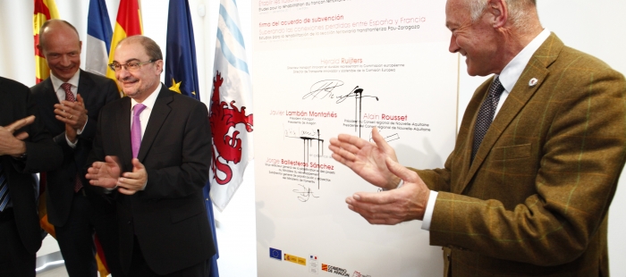 La firma del acuerdo de subvención con la UE se ha llevado a cabo tras la presentación del dossier de la financiación europea, en la que han participado el consejero de Vertebración del Territorio, Movilidad y Vivienda, José Luis Soro; Alain Autruffe de SNCF Rèseau; Jorge Ballesteros, subdirector general de planificación y proyectos del Ministerio de Fomento; y Luc Federman, director general adjunto de transporte, infraestructura, movilidad y medio ambiente del Conseil regional de Nouvelle- Aquitaine.