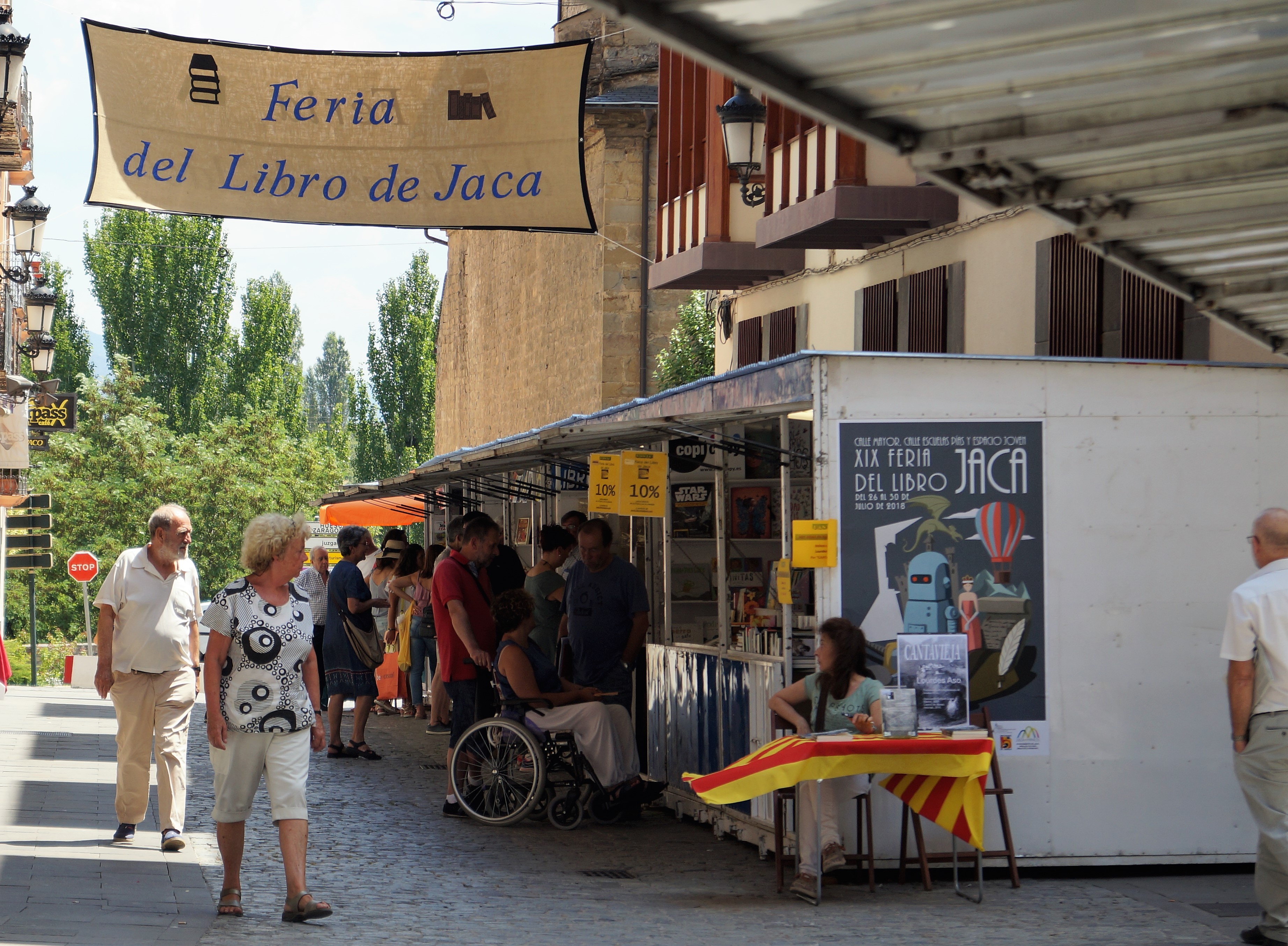 La Feria del Libro de Jaca, que alcanza su décimo novena edición, acaba de abrir sus puertas en la Calle Mayor. El certamen se celebrará hasta el 30 de julio y regresa al casco histórico. 22 entidades, 20 casetas y cerca de 60 autores han confirmado su presencia en el evento. La Calle Mayor, la calle Escuelas Pías, el Espacio Joven y la Plaza del Ángel vuelven a ser los escenarios elegidos tras la buena acogida del año pasado, que era la primera vez que se sacaba la propuesta del Paseo de la Constitución. Desde primera hora, el ambiente ha estado animado, si bien se espera que acuda mayor cantidad de público a partir de esta tarde. Los cómics y un concierto de la Escuela Muncipal de Músca han sido los protagonistas de las actividades paralelas en esta primera mañana de feria.