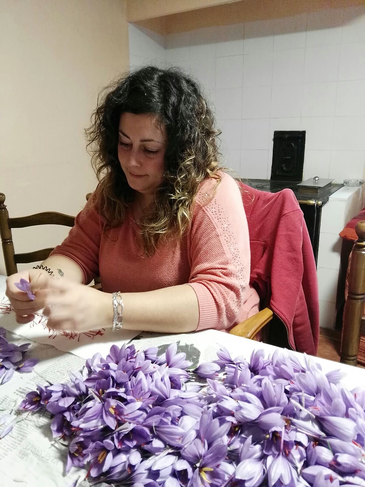 La campaña del azafrán se limita a unos días: cuando la planta florece, hay que recoger las flores y, después, extraerles las hebras de color granate. Son cuatro hilos, a veces cinco, lo que se considera algo extraordinario. Todo artesanalmente, por lo que supone un gran esfuerzo. En torno a la festividad del Pilar, se recoge toda la producción del año. El resto del tiempo, hay que preocuparse de mantener el cultivo, abonarlo, limpiarlo de malas hierbas y luchar contra las plagas, como los ratones.