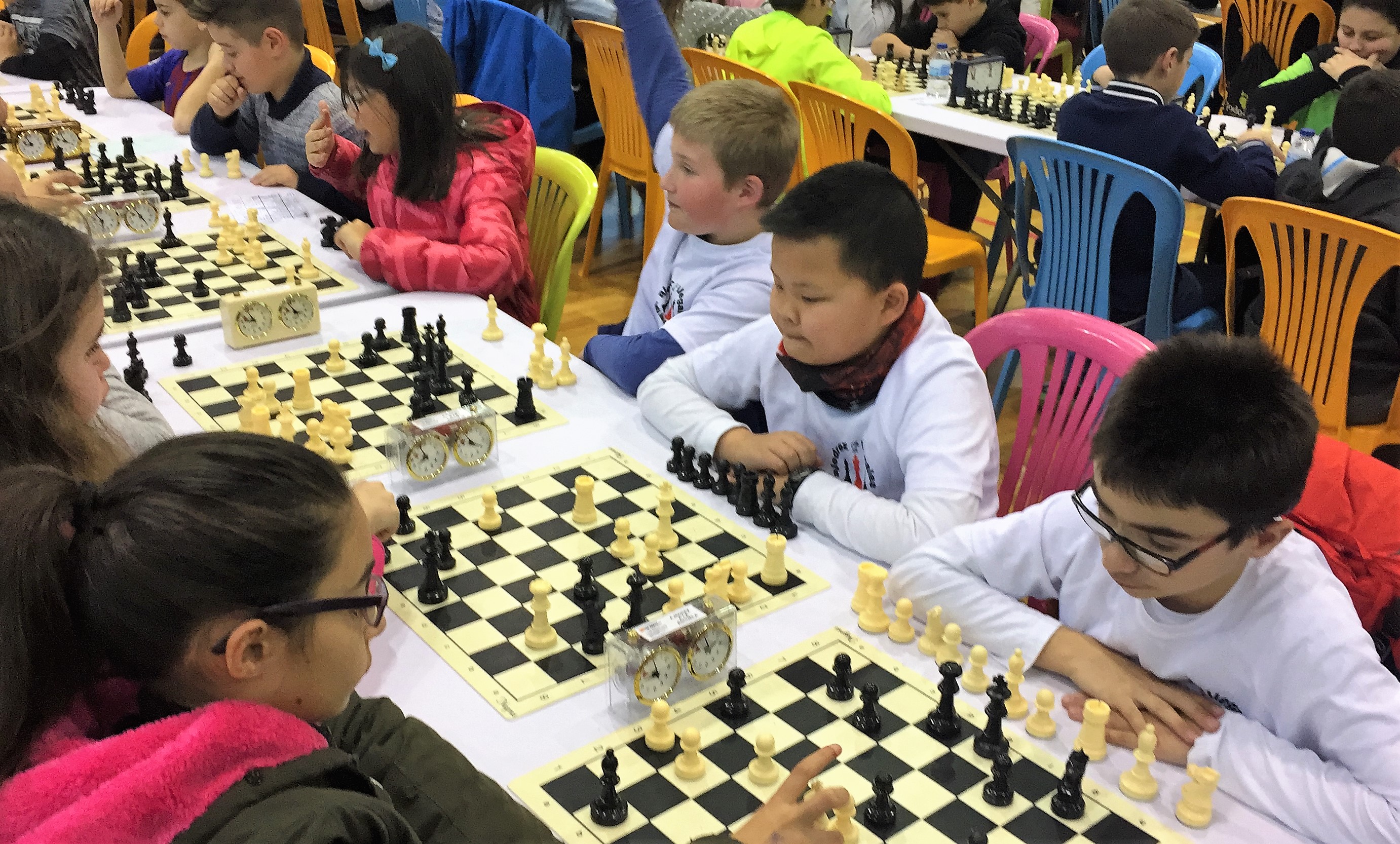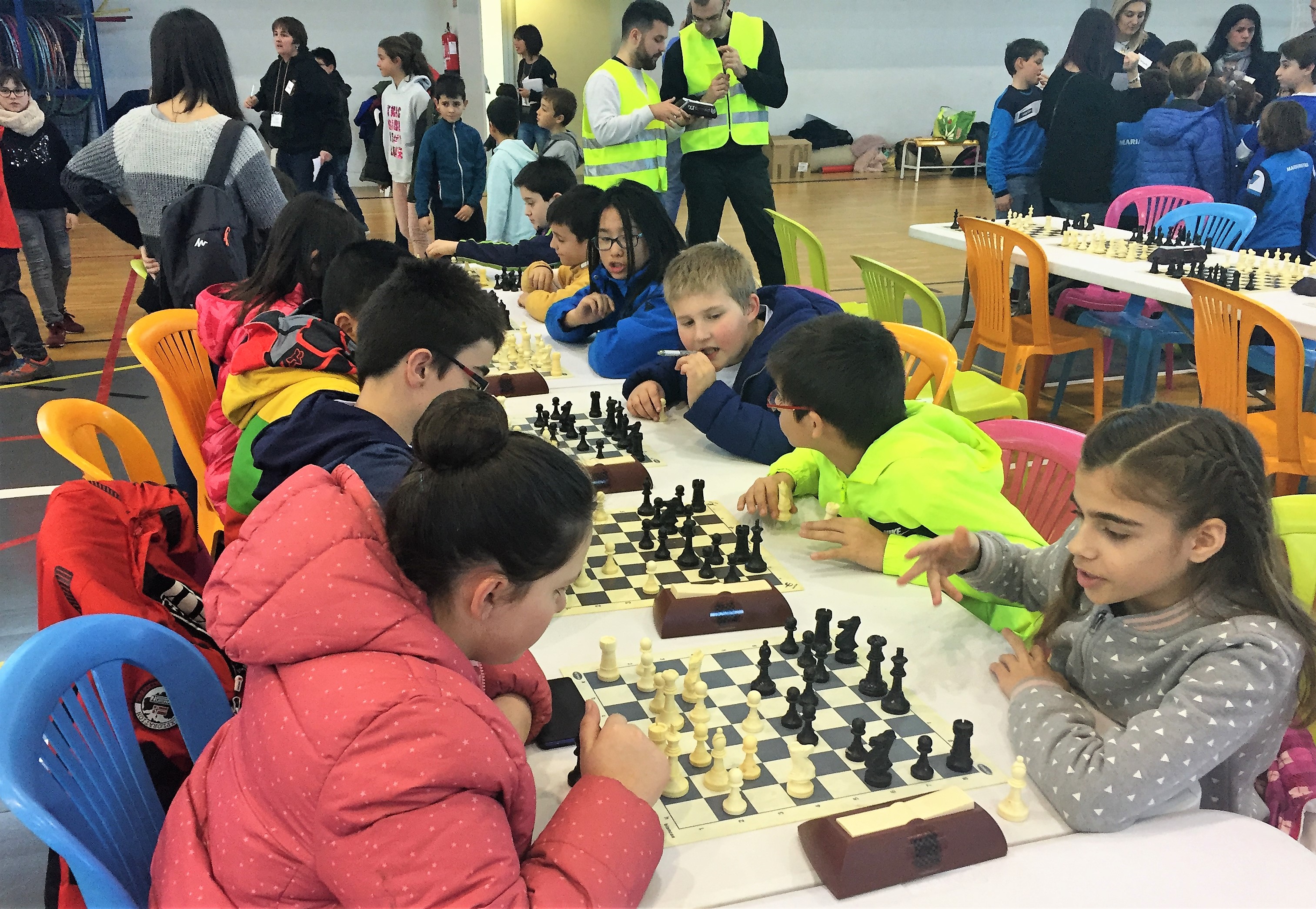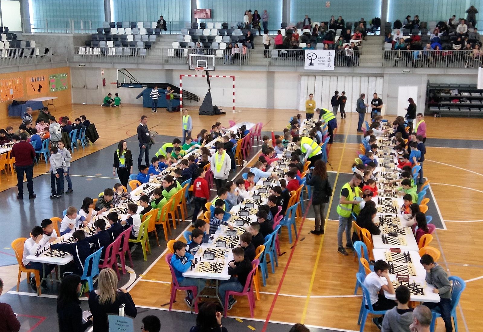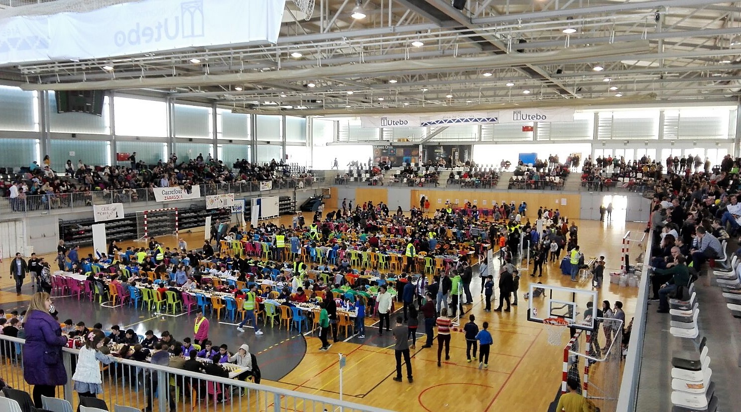 Una buena experiencia ajedrecística y de excelente conviviencia. Una excelente organización. Más de 500 niños y niñas de colegios aragoneses, entre los que se encontraban escolares de la provincia de Zaragoza, alguno de la provincia de Teruel y el colegio Santa Ana de Sabiñánigo, como representante único de la provincia de Huesca, disfrutaron de una jornada de convivencia jugando al ajedrez en la tarde del pasado domingo en el Pabellón Municipal de Las Fuentes de Utebo, acompañados por numerosos padres y familiares, que llenaron las gradas del Pabellón durante las cuatro horas que duró esta convivencia entre casillas y piezas de ajedrez en la búsqueda del jaque mate. Una jornada que comenzaba a las 16.00 horas y finalizaba a las 20.00 horas y donde los escolares participantes tuvieron que jugar seis rondas de 7 minutos, por equipos de 4 cuatro jugadores divididos en cuatro categorías diferenciadas, desde 1º de Primaria hasta la ESO.