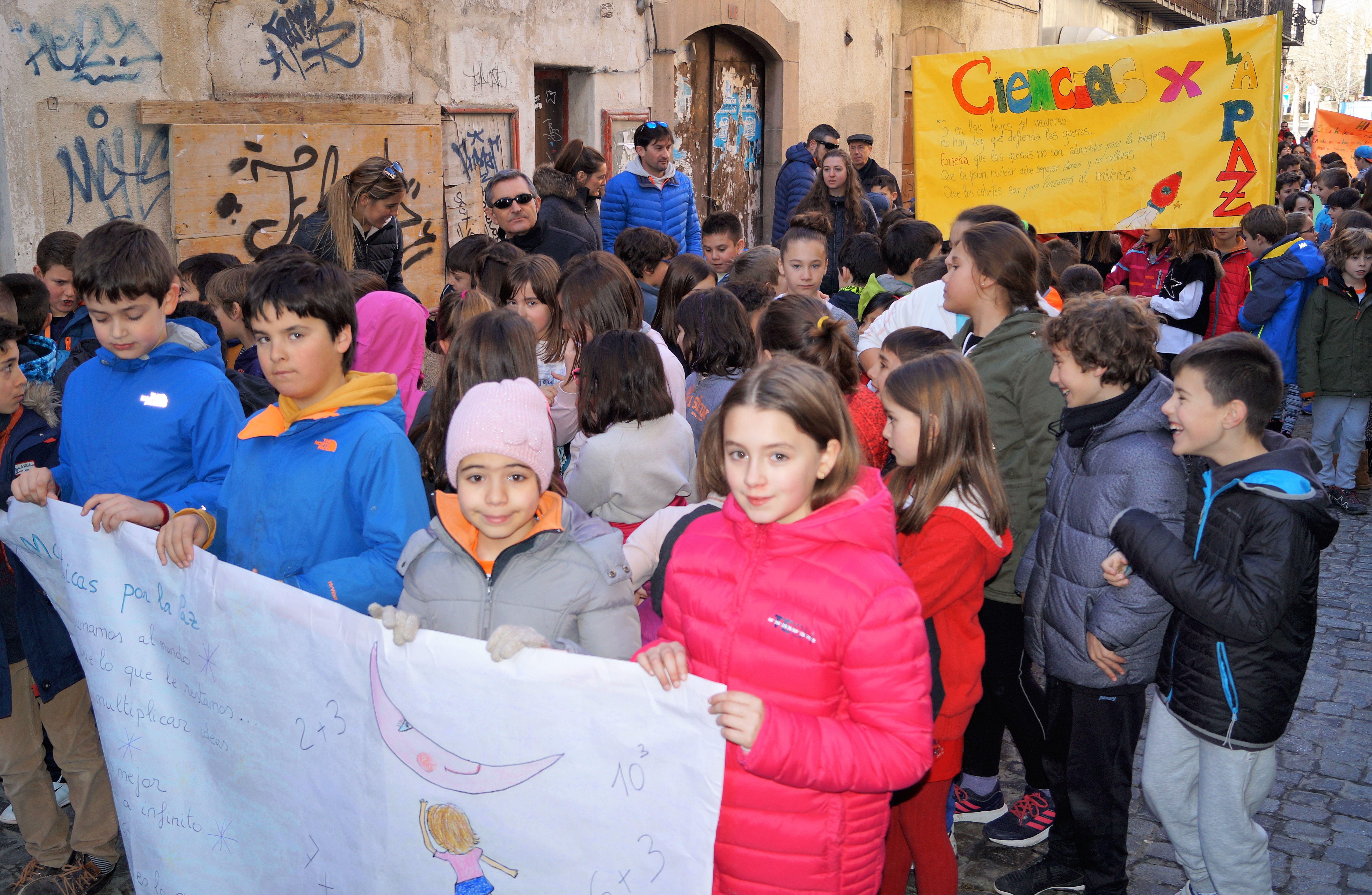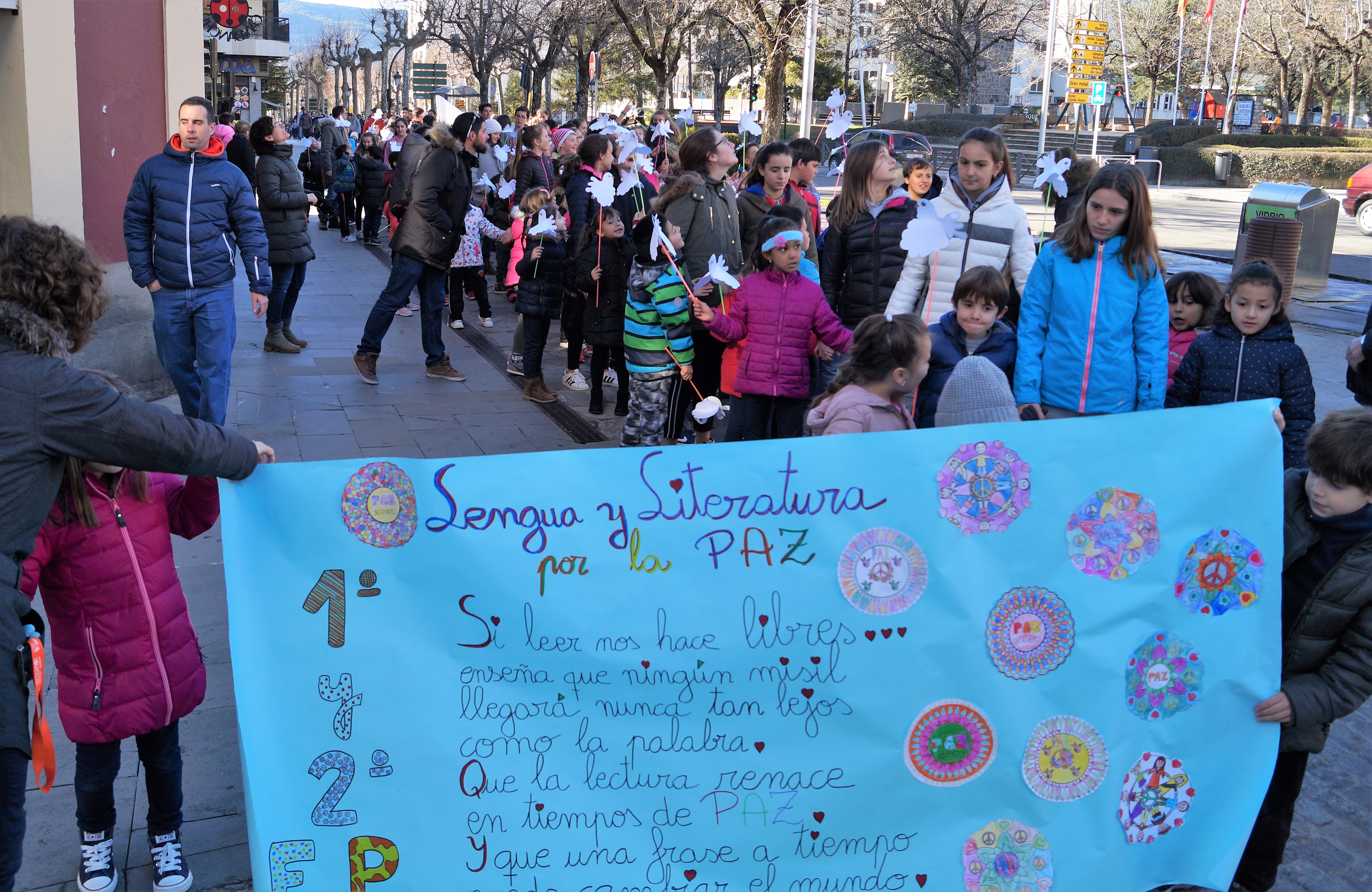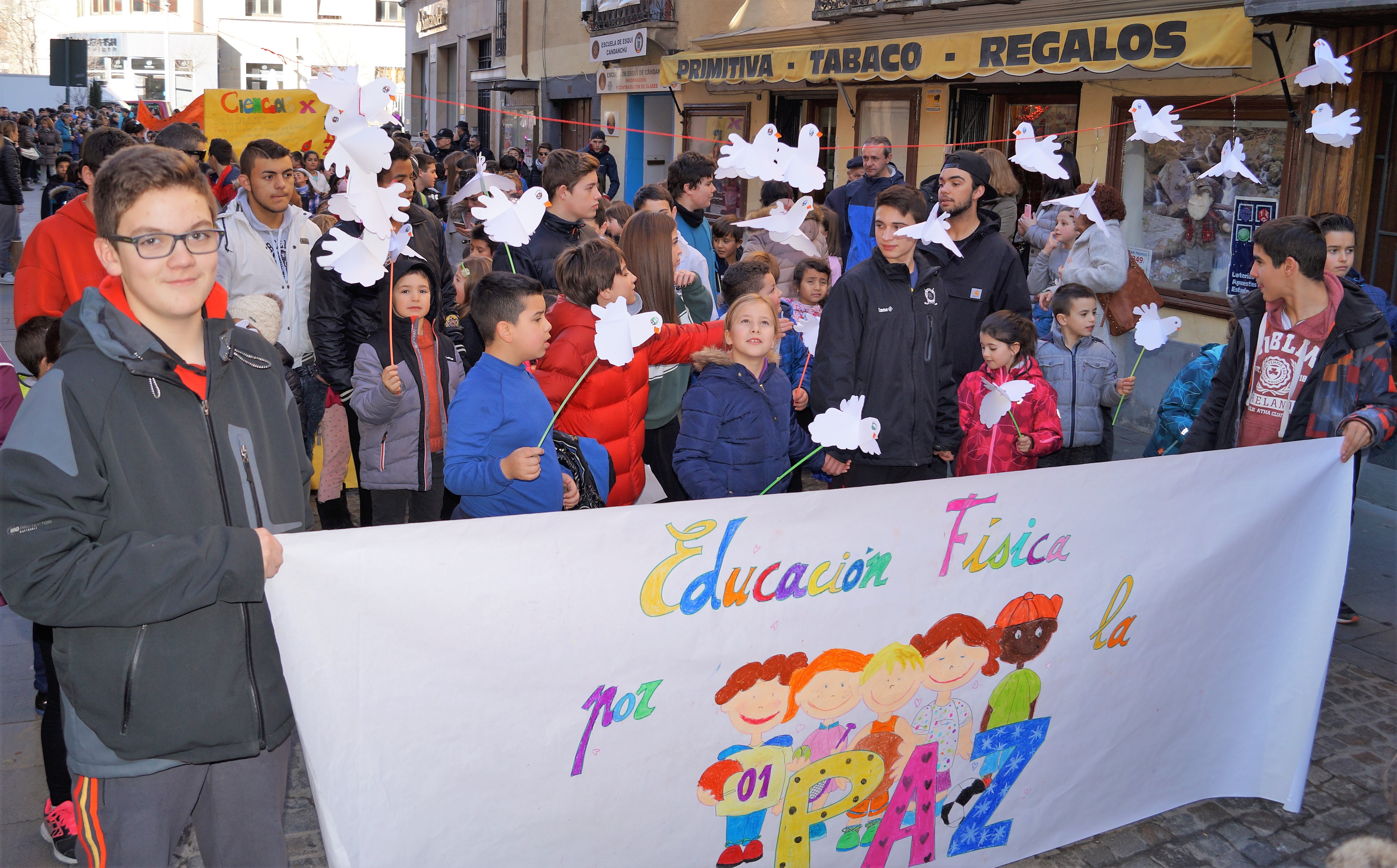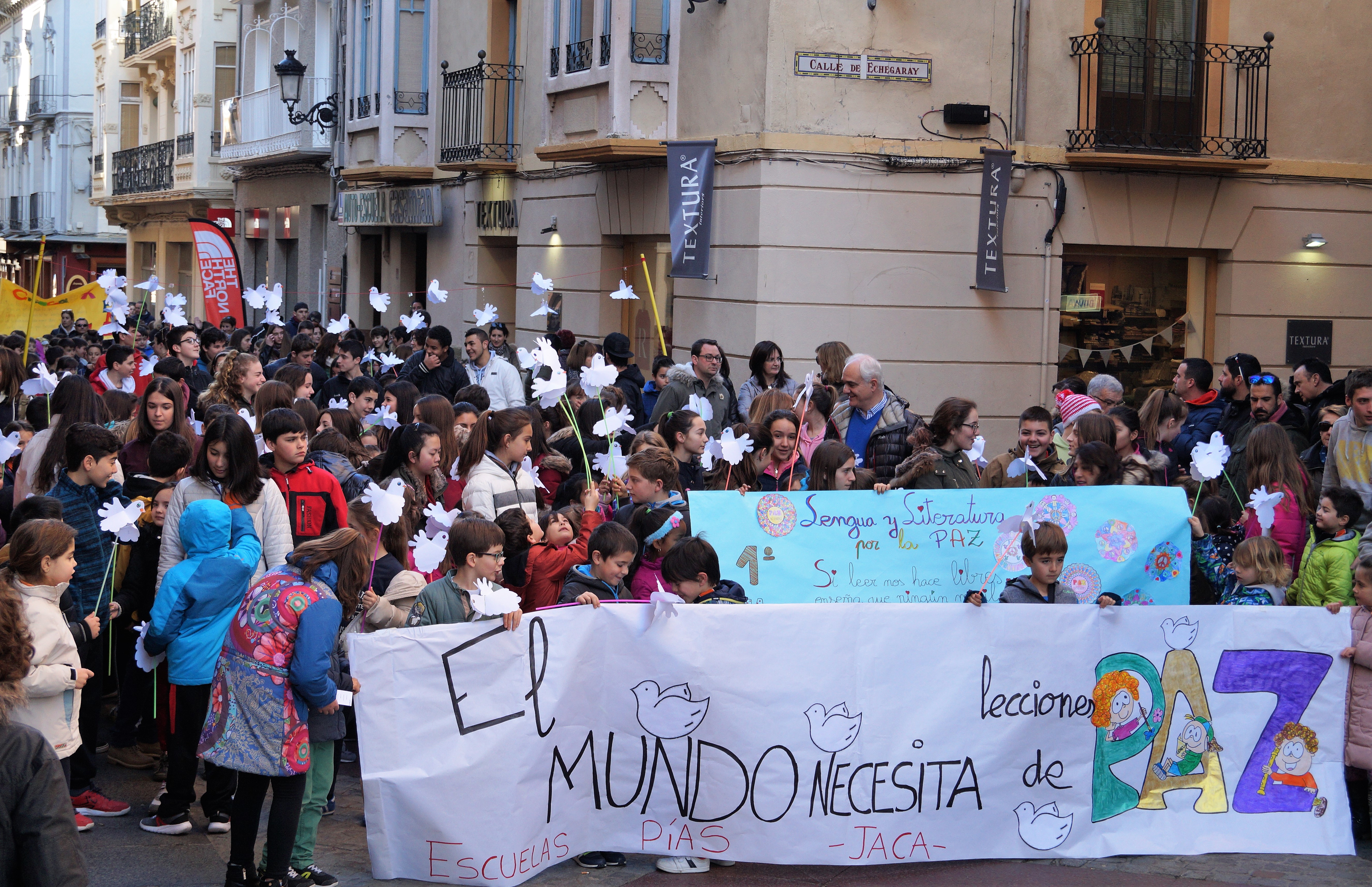 La Marcha por la Paz, que se celebra en Jaca ya desde hace varios años el 30 de enero, secundando la conmemoración internacional de esta jornada que recuerda la muerte de Gandhi desde 1964, colapsaba la Calle Mayor y concluía en la puerta del Ayuntamiento. Allí, el concejal de Educación, Enrique Muñoz, acompañado de José Ignacio Bilbao y María Pilar Moreno (director titular y directora académica de Escolapios de Jaca, respectivamente) se dirigían a los niños y adolescentes en una jornada que ya se ha convertido en todo un símbolo en contra de los comportamientos violentos y en favor de una sociedad más tolerante. Antes, a lo largo de toda la Calle Mayor, desfilaban los alumnos de Escuelas Pías (los más pequeños, de la mano de sus compañeros mayores), portando pancartas con mensajes alusivos a cada asignatura y con slogan en favor de un mundo mejor.