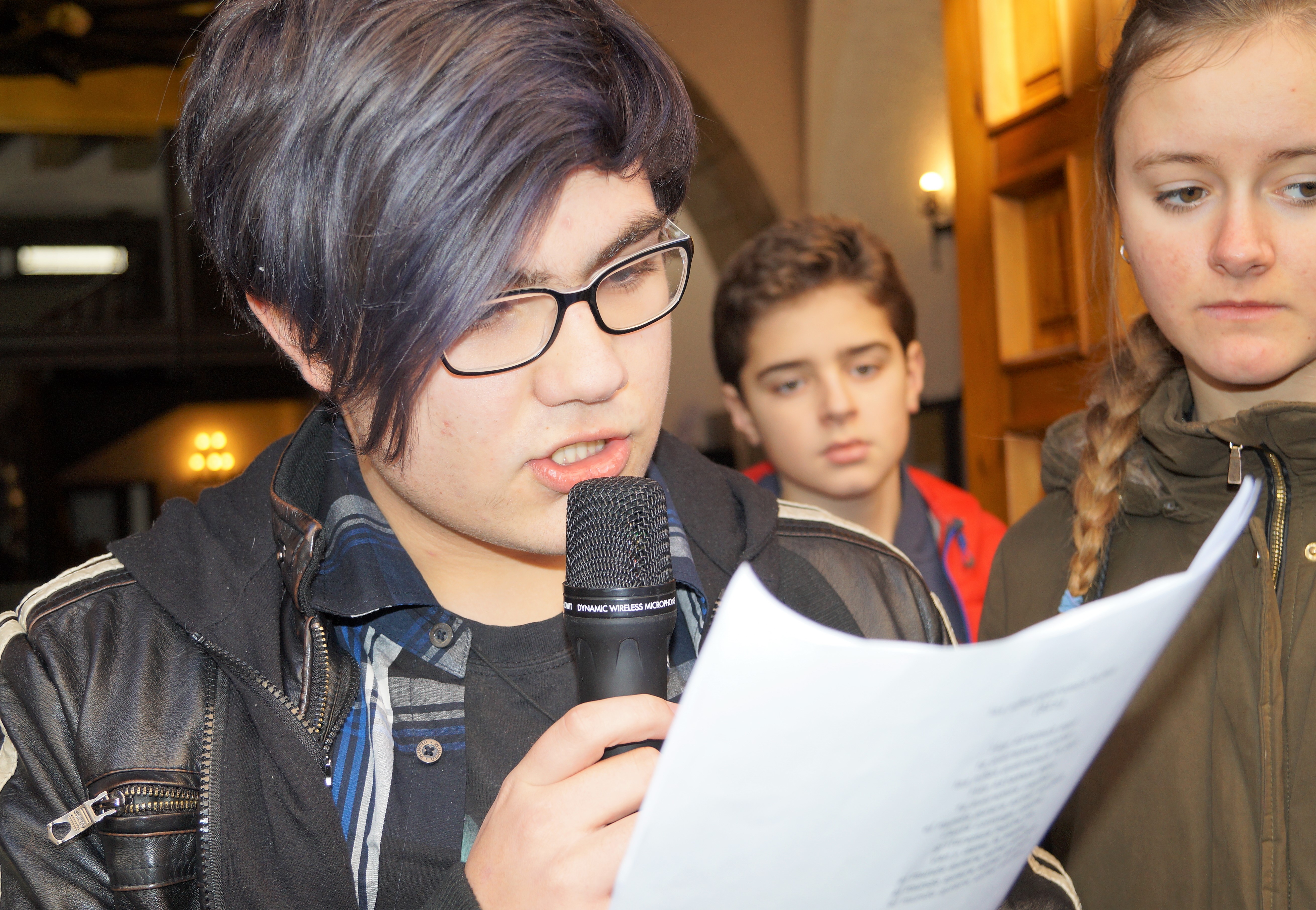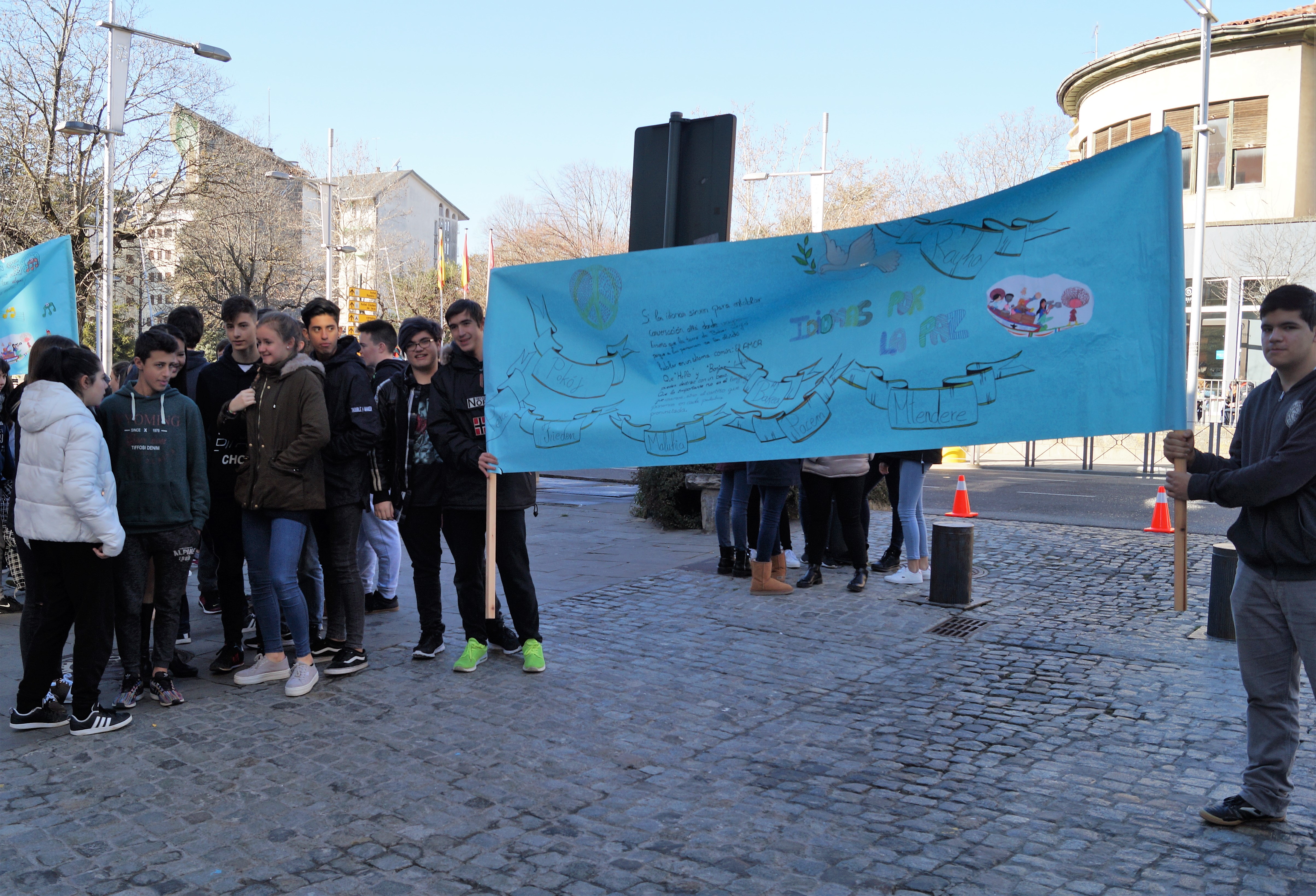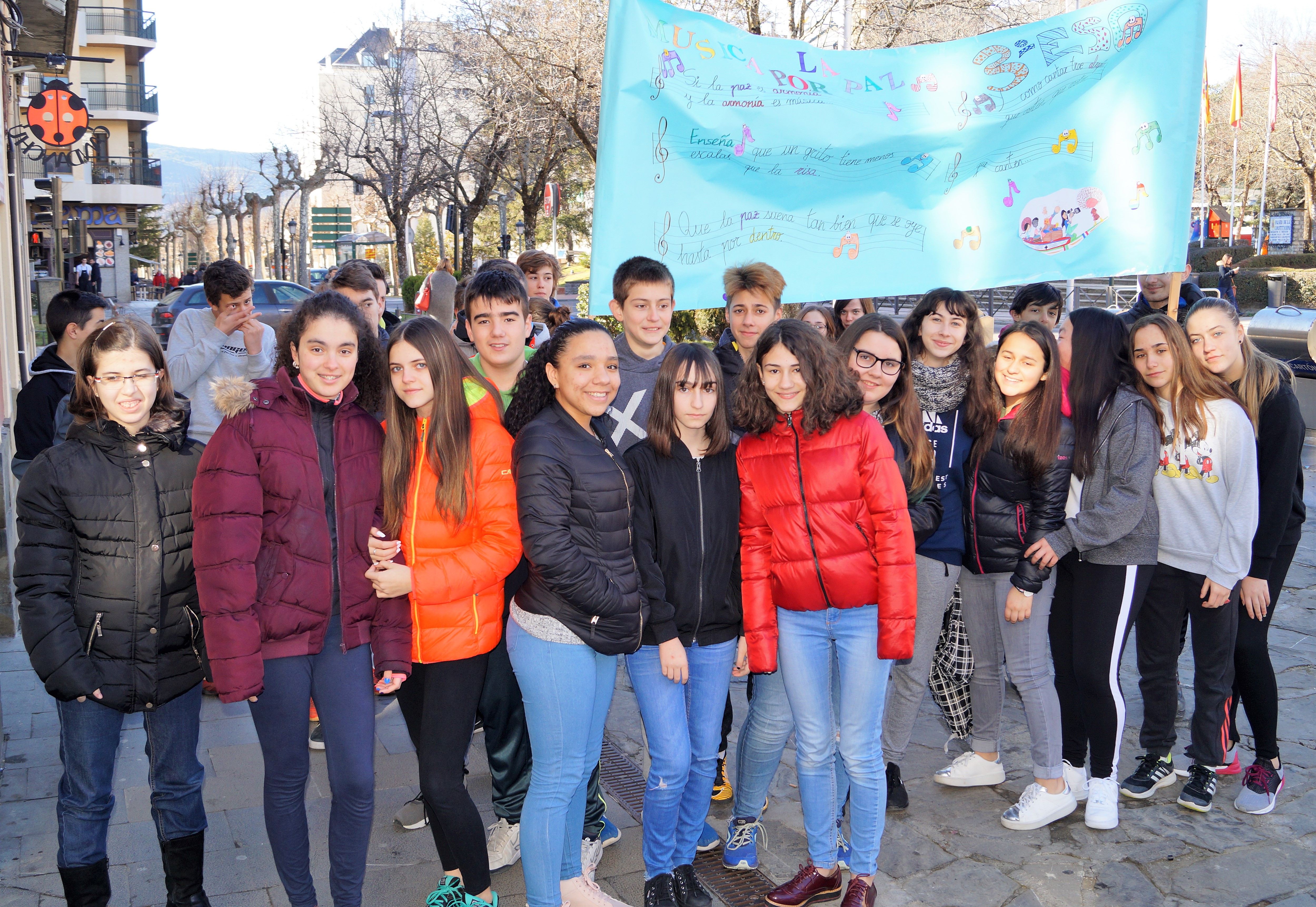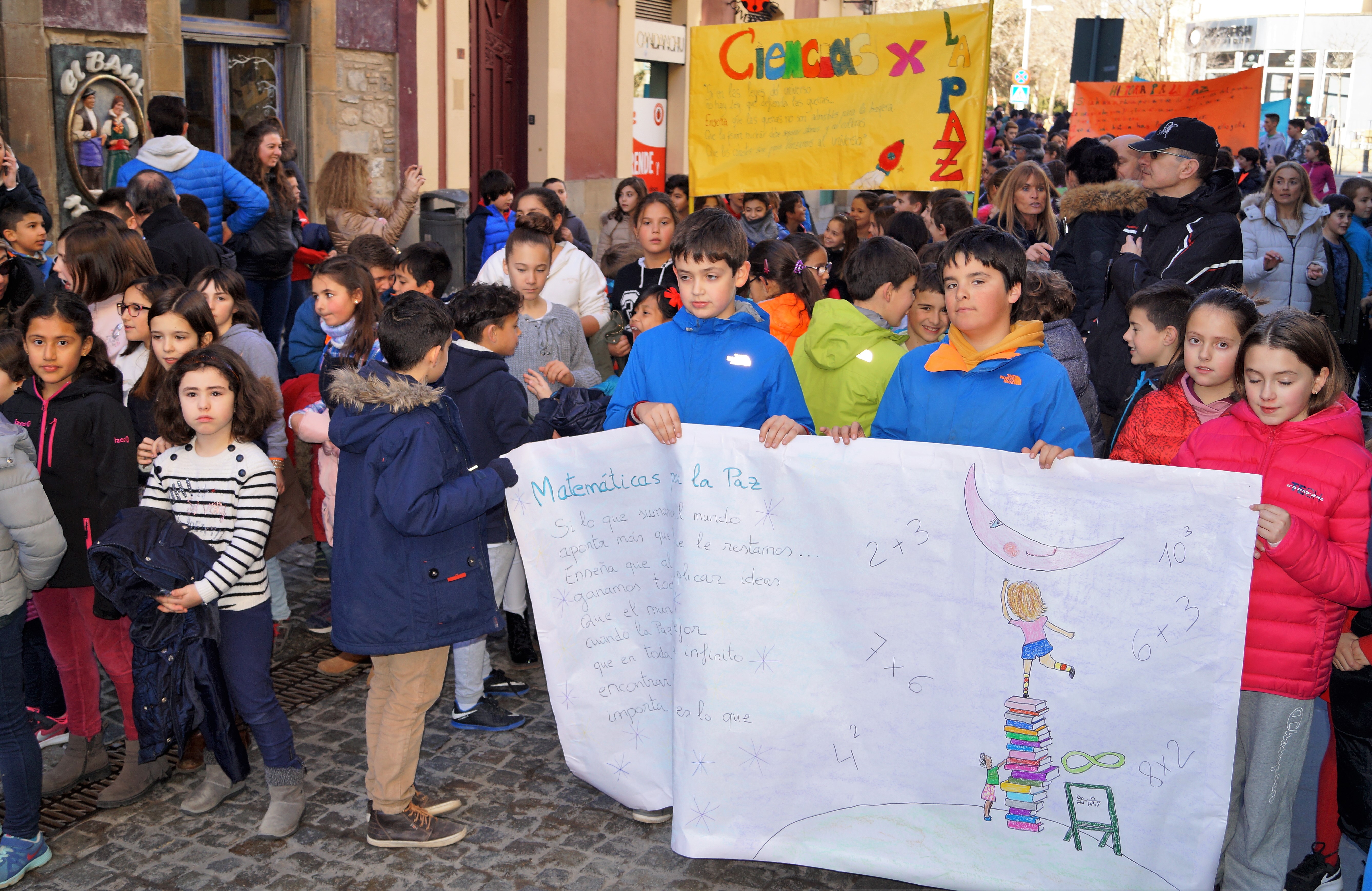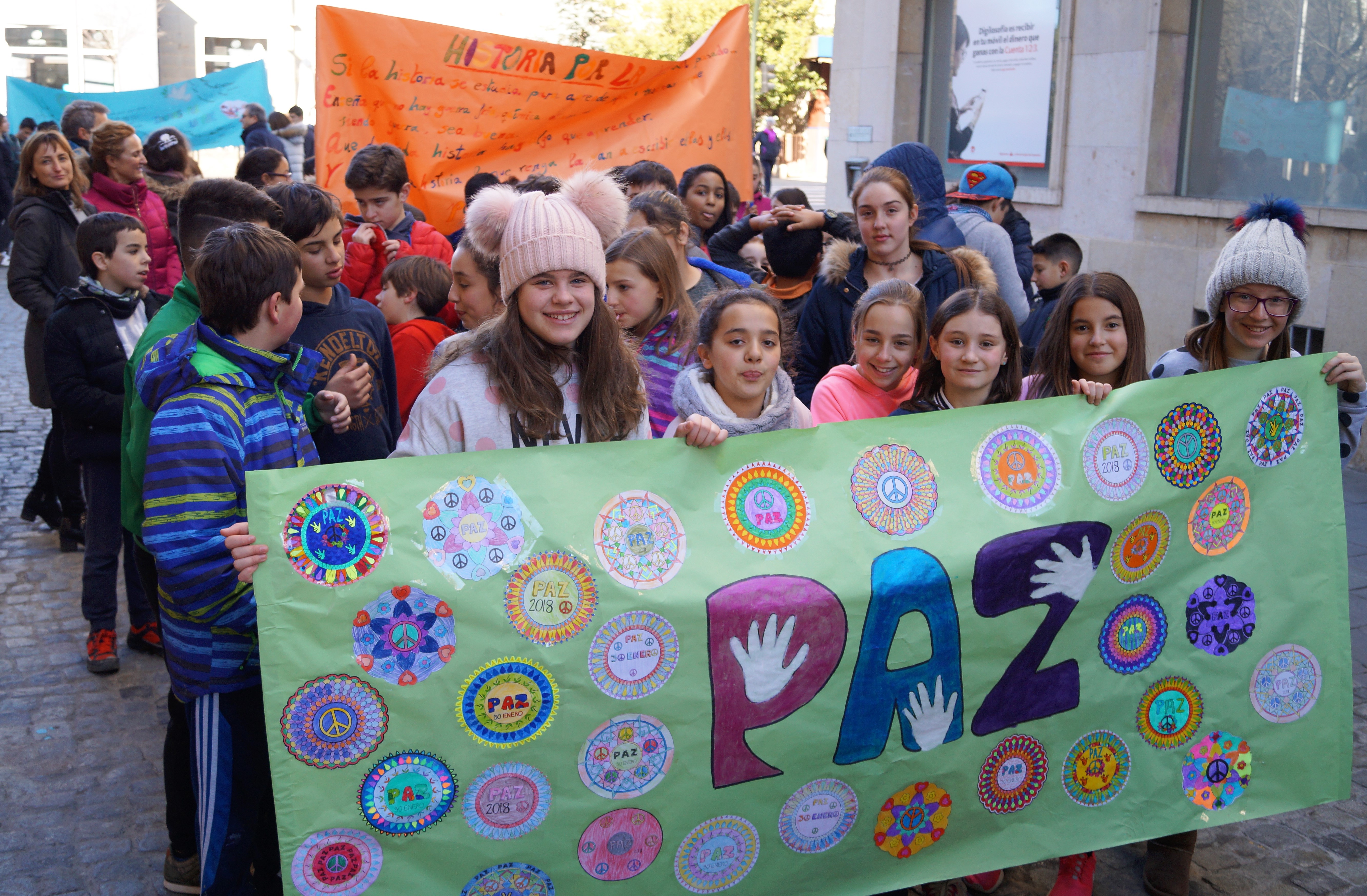 La Marcha por la Paz, que se celebra en Jaca ya desde hace varios años el 30 de enero, secundando la conmemoración internacional de esta jornada que recuerda la muerte de Gandhi desde 1964, colapsaba la Calle Mayor y concluía en la puerta del Ayuntamiento. Allí, el concejal de Educación, Enrique Muñoz, acompañado de José Ignacio Bilbao y María Pilar Moreno (director titular y directora académica de Escolapios de Jaca, respectivamente) se dirigían a los niños y adolescentes en una jornada que ya se ha convertido en todo un símbolo en contra de los comportamientos violentos y en favor de una sociedad más tolerante. Antes, a lo largo de toda la Calle Mayor, desfilaban los alumnos de Escuelas Pías (los más pequeños, de la mano de sus compañeros mayores), portando pancartas con mensajes alusivos a cada asignatura y con slogan en favor de un mundo mejor.