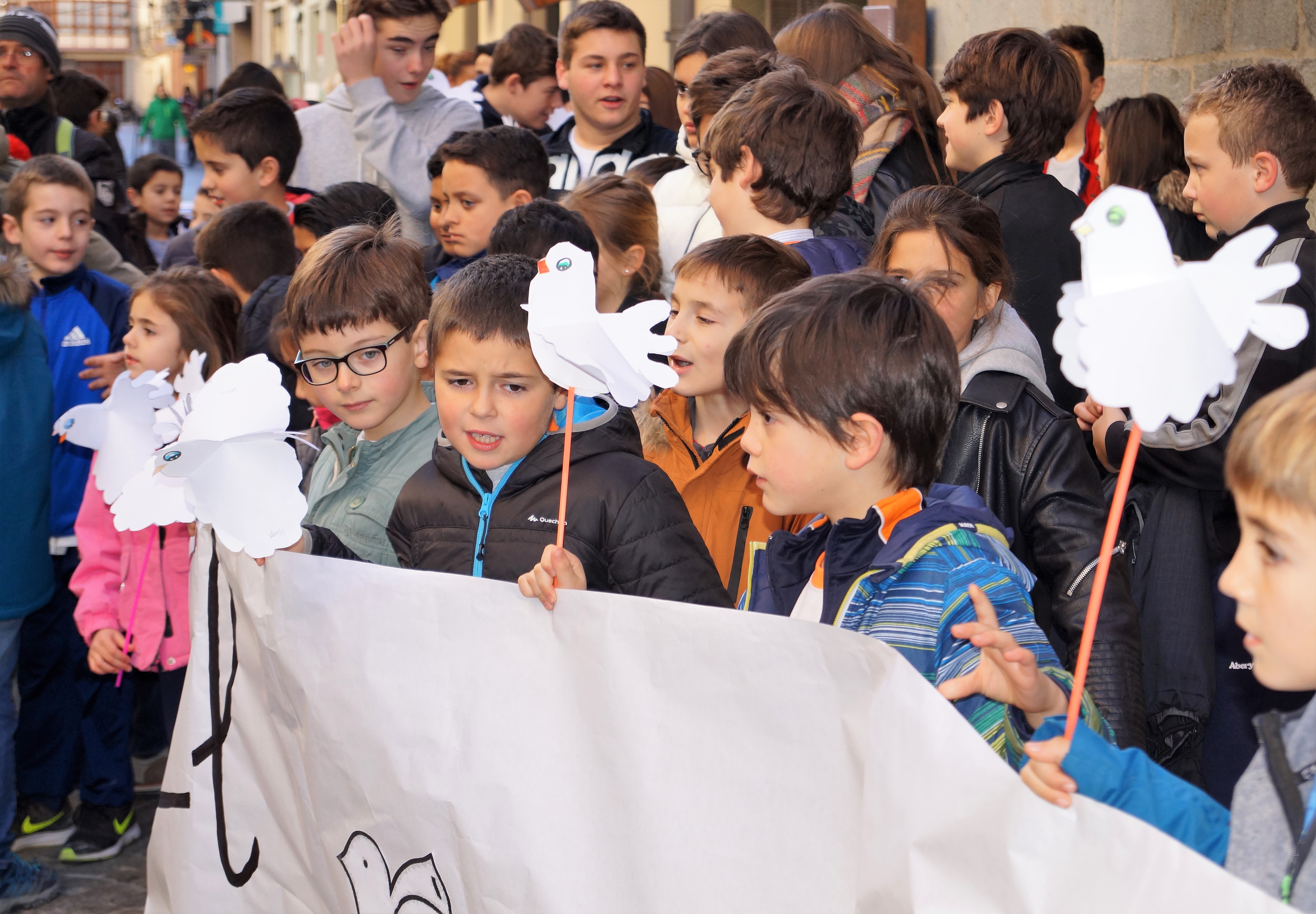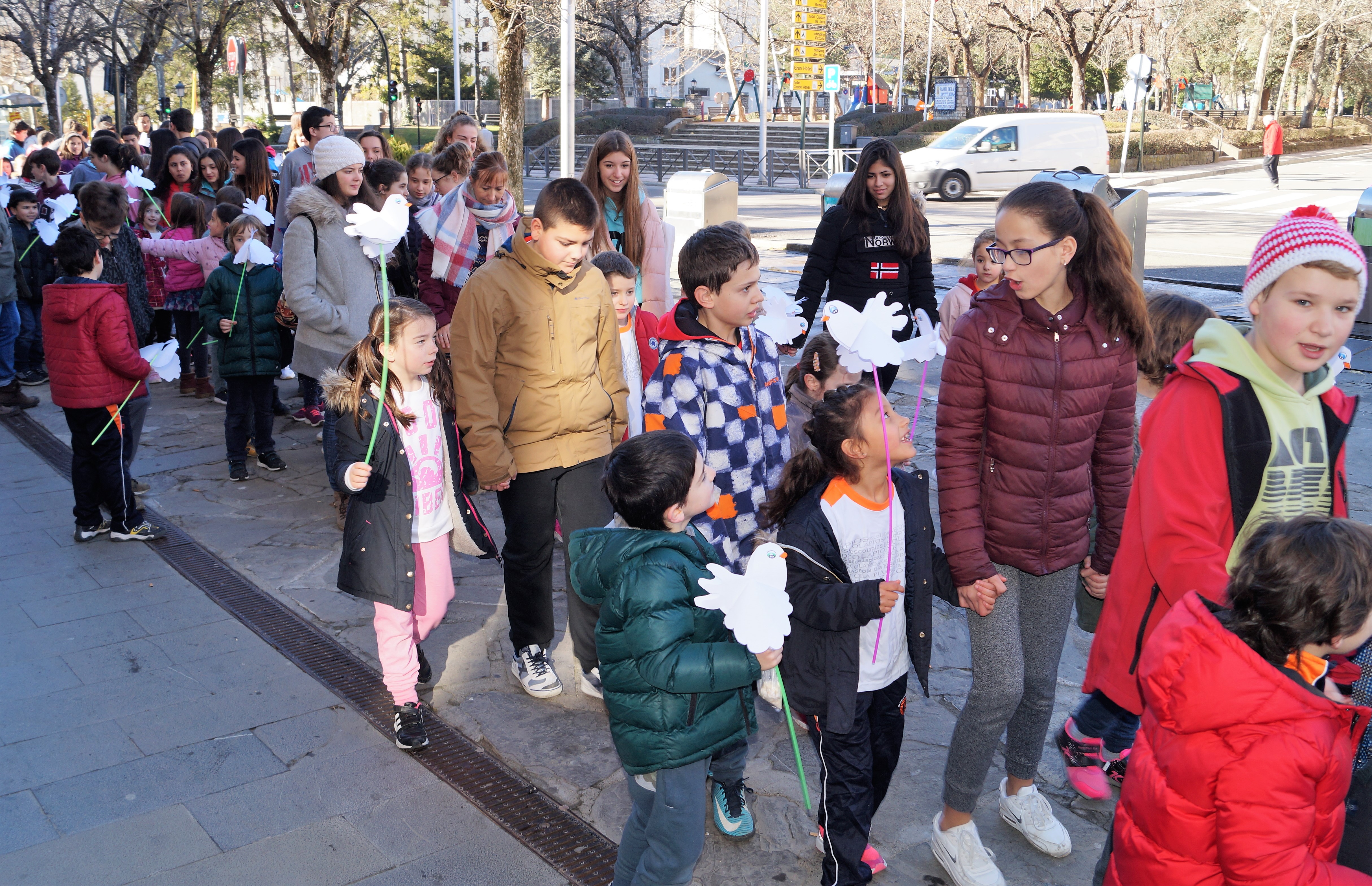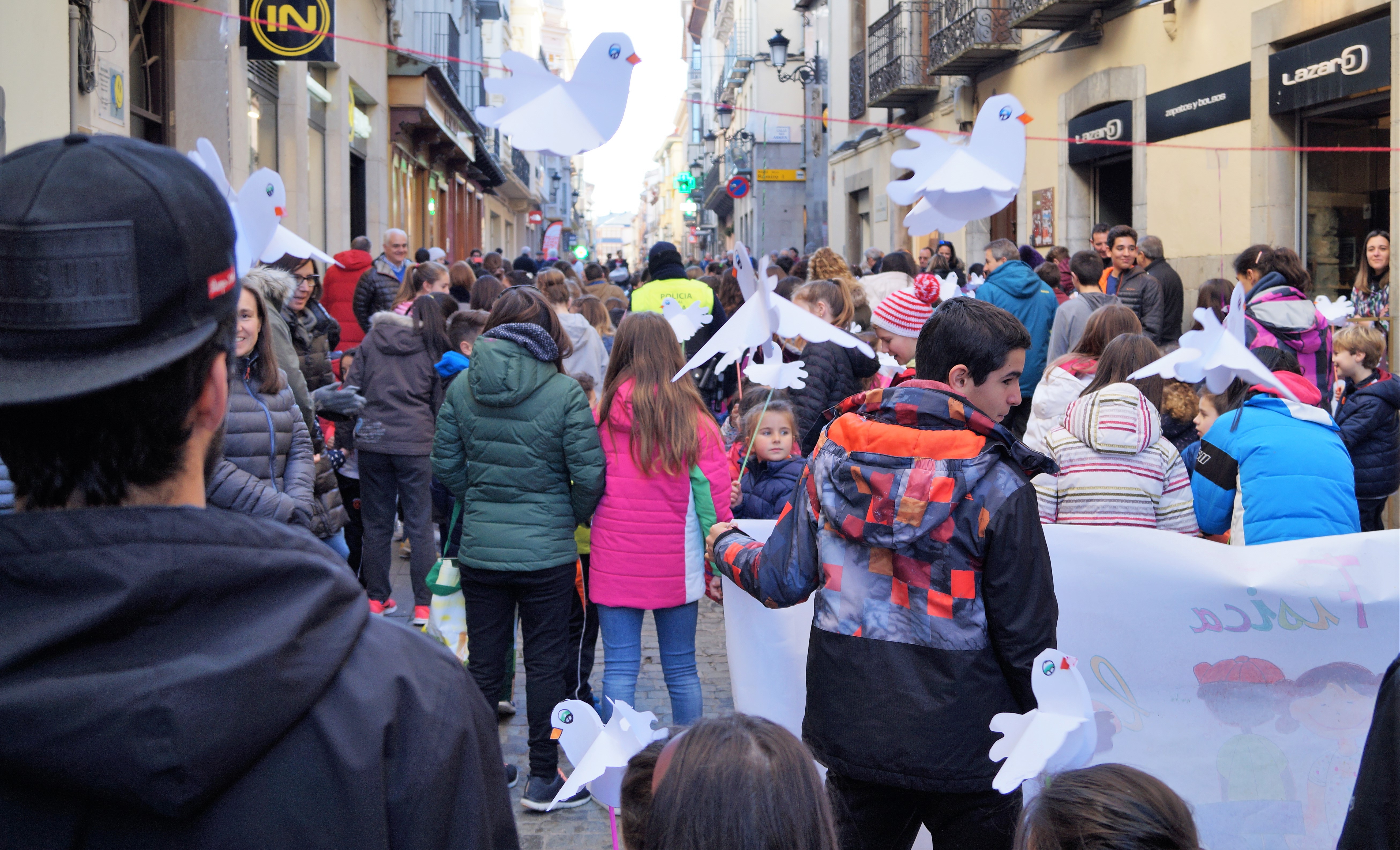 Más de 500 alumnos de Escuelas Pías, acompañados de profesores, padres y otros miembros de la comunidad educativa, llenaban las calles de Jaca de palomas blancas en el Día Escolar de la No Violencia y la Paz.