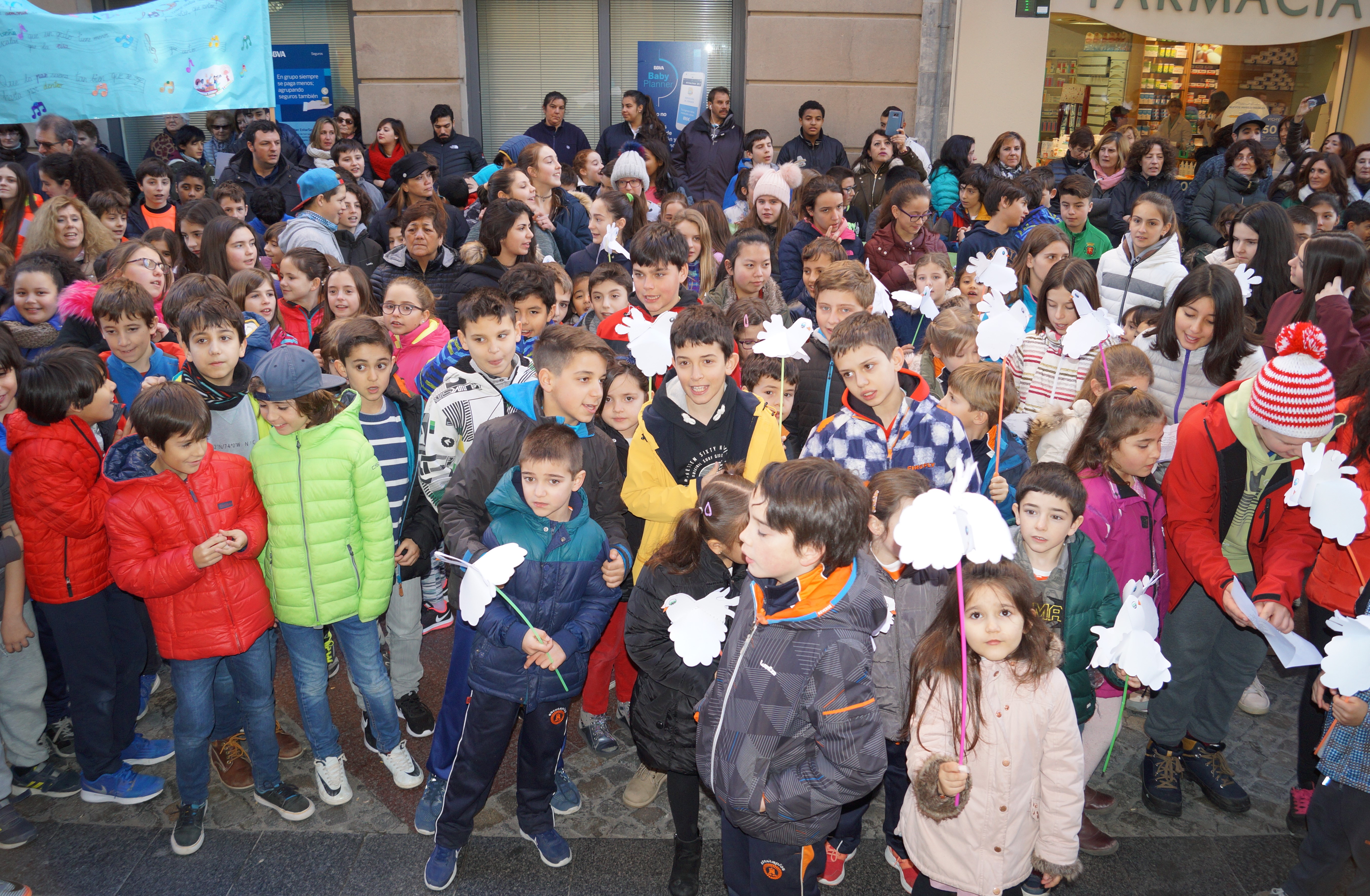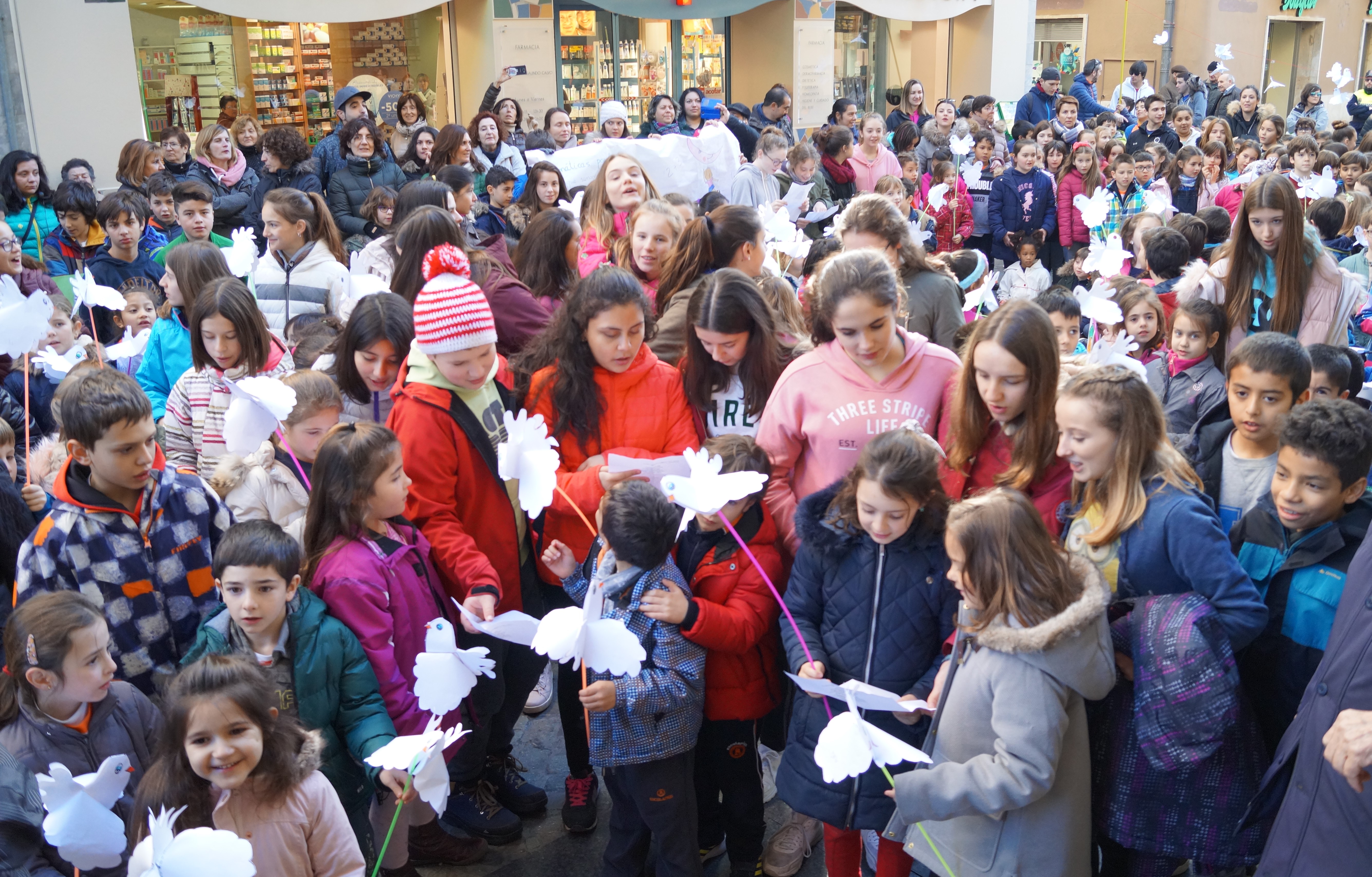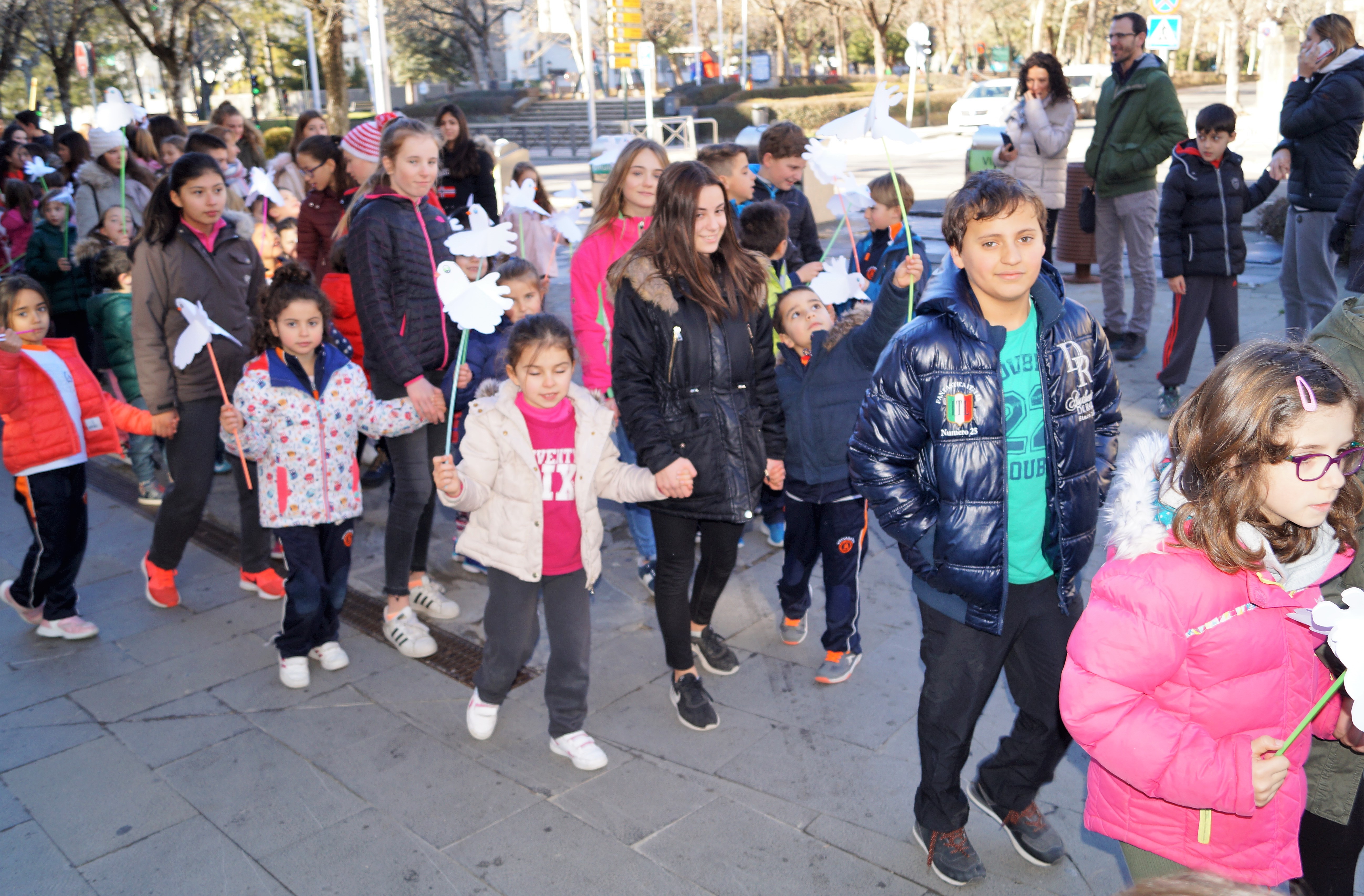 Más de 500 alumnos de Escuelas Pías, acompañados de profesores, padres y otros miembros de la comunidad educativa, llenaban las calles de Jaca de palomas blancas en el Día Escolar de la No Violencia y la Paz.
