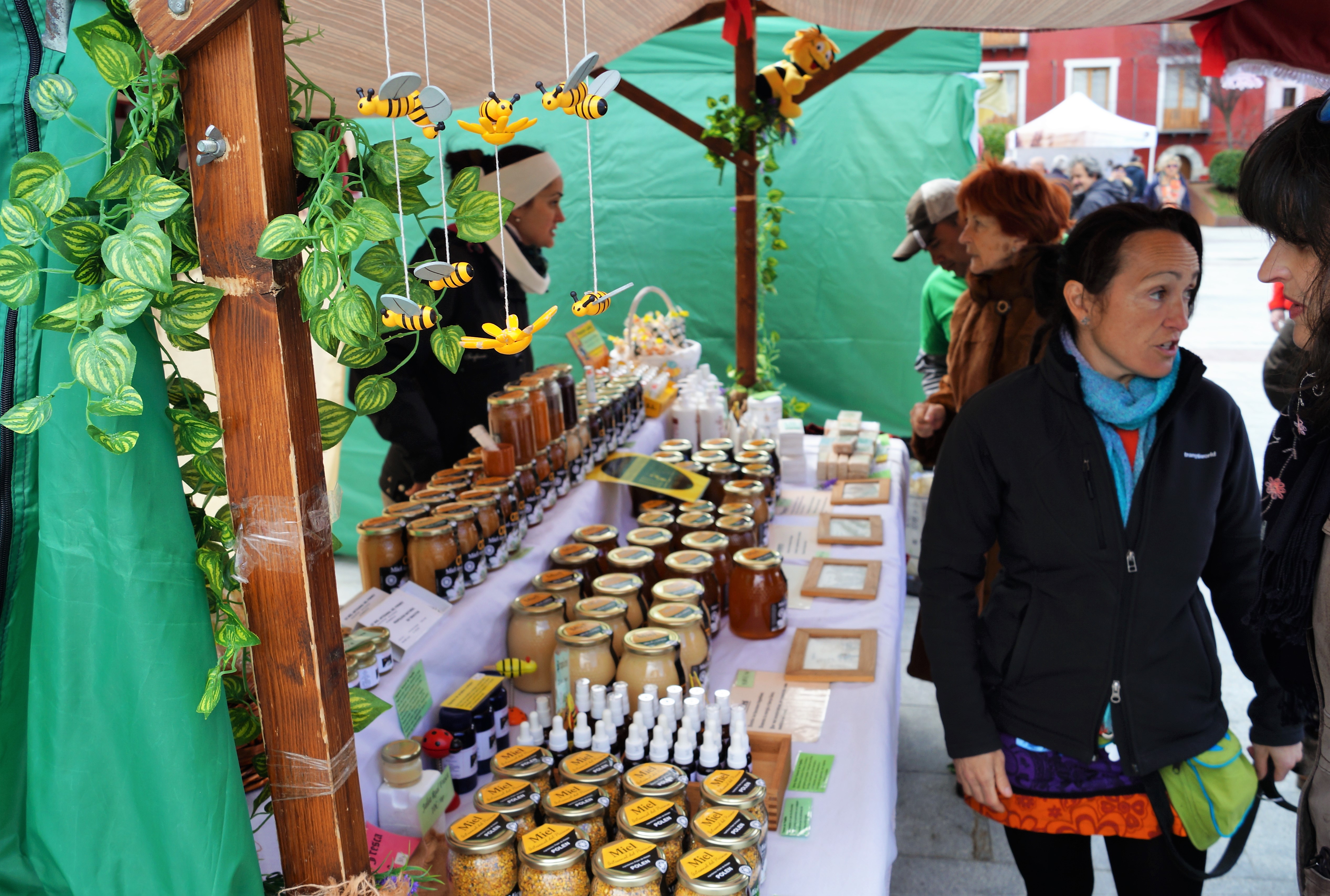Entre los productos agroalimentarios que están a la venta en el mercado se incluye cerveza, queso, miel, hidromiel, vino, verdura, galletas artesanales y ternera. Jacarte presenta trabajos de pintura, fotografía e ilustración. Cuero, jabones, joyas, abanicos y tazas pintadas artesanalmente o textil son algunos de los productos que aportarán los artesanos que, además, ofrecerán tres talleres durante la feria, como los de pulseraas y jabones (que ya se han celebrado) o el de cuencos de cerámica que tendrá lugar mañana, sábado, a partir de las 11.30 horas.