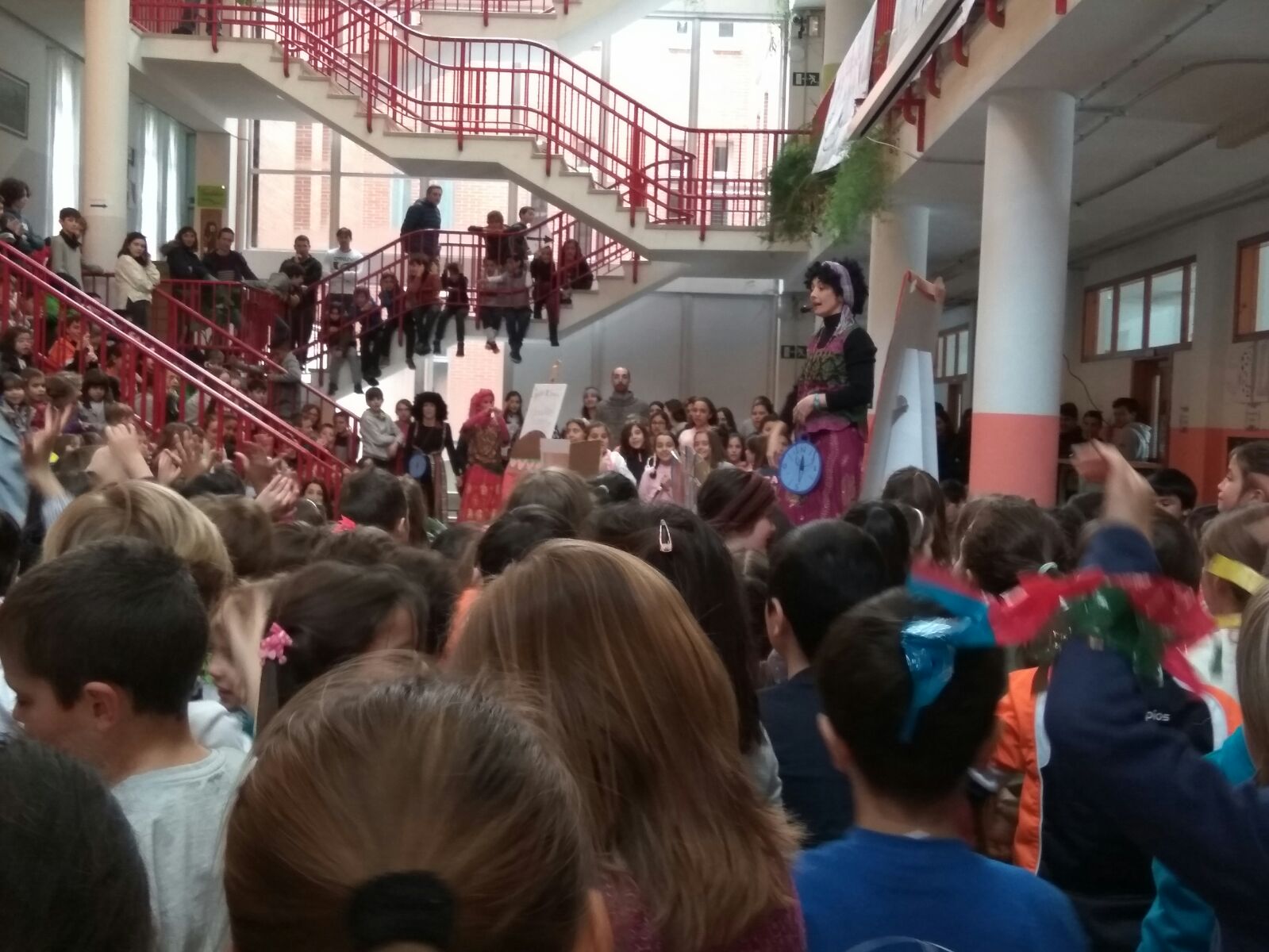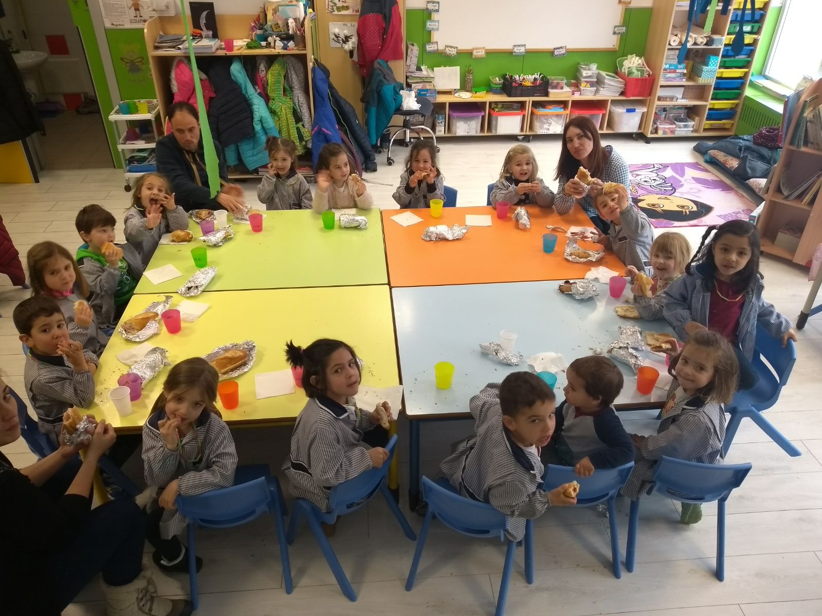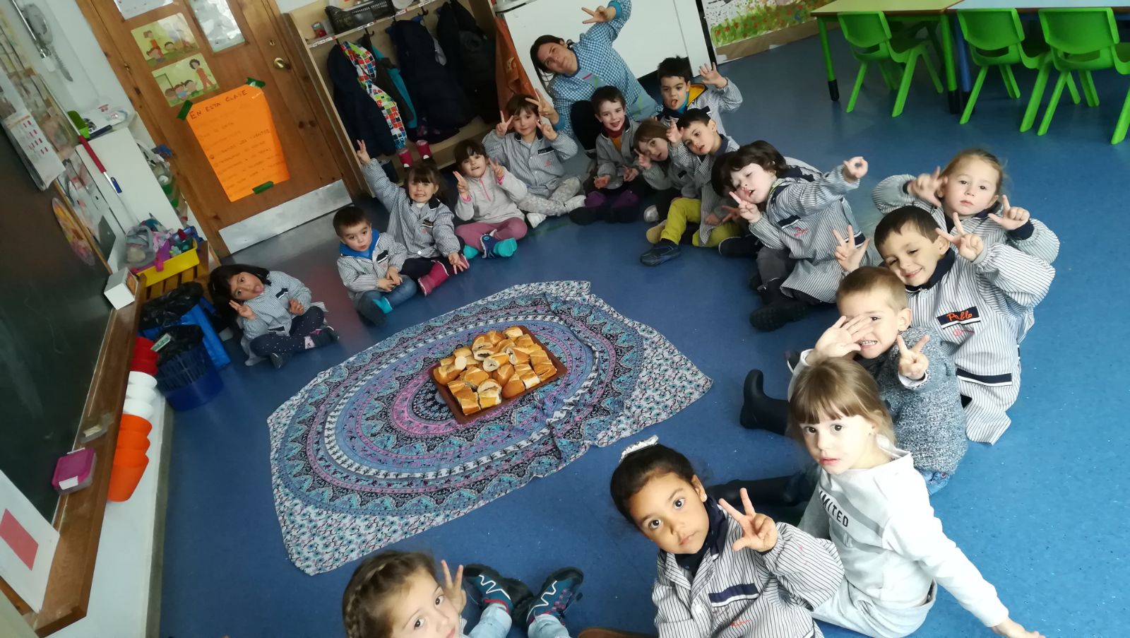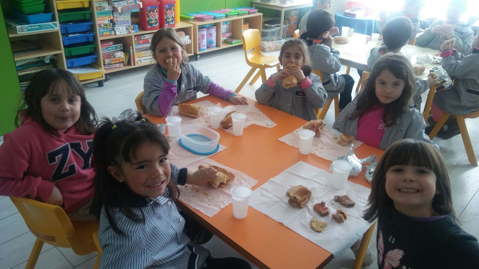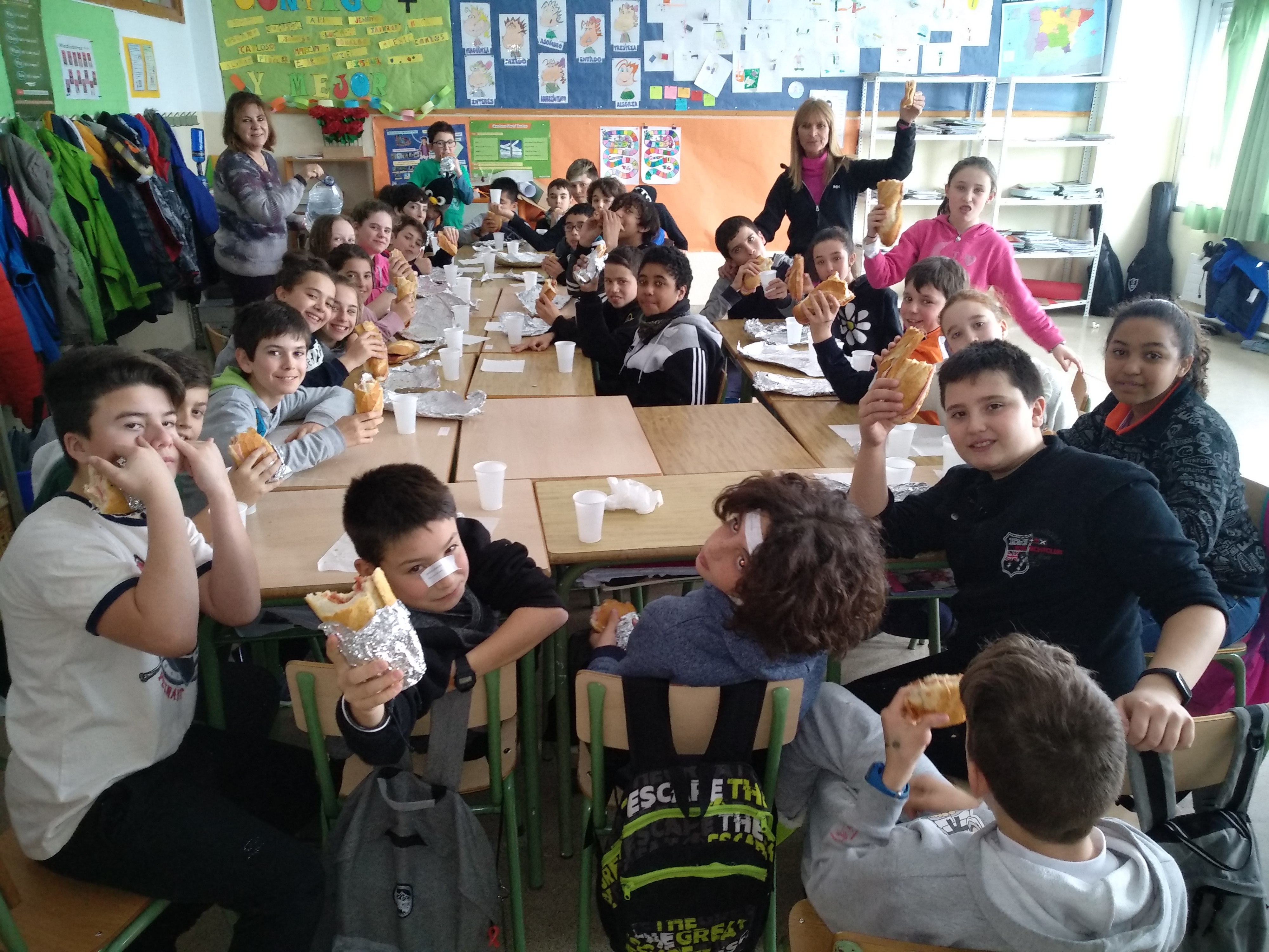 Pero este año no sólo iba a ser el bocadillo, sino que íbamos a celebrar una fiesta por todo lo alto. La jornada comenzó con la elaboración de los bocadillos. ¡Esta campaña hemos logrado un récord! Fueron algunos padres y profesores los encargados de preparar con tanto cariño los manjares que más tarde degustaríamos. Para después del almuerzo, habíamos preparado una sorpresa para las familias que se habían quedado a comer con nosotros, que consistía en un baile africano con coreografía y percusión corporal. Algunos de los alumnos también nos acompañaron con diferentes instrumentos (flauta, violín, guitarra…); incluso, algunas profes se atrevieron a disfrazarse de auténticas senegalesas.