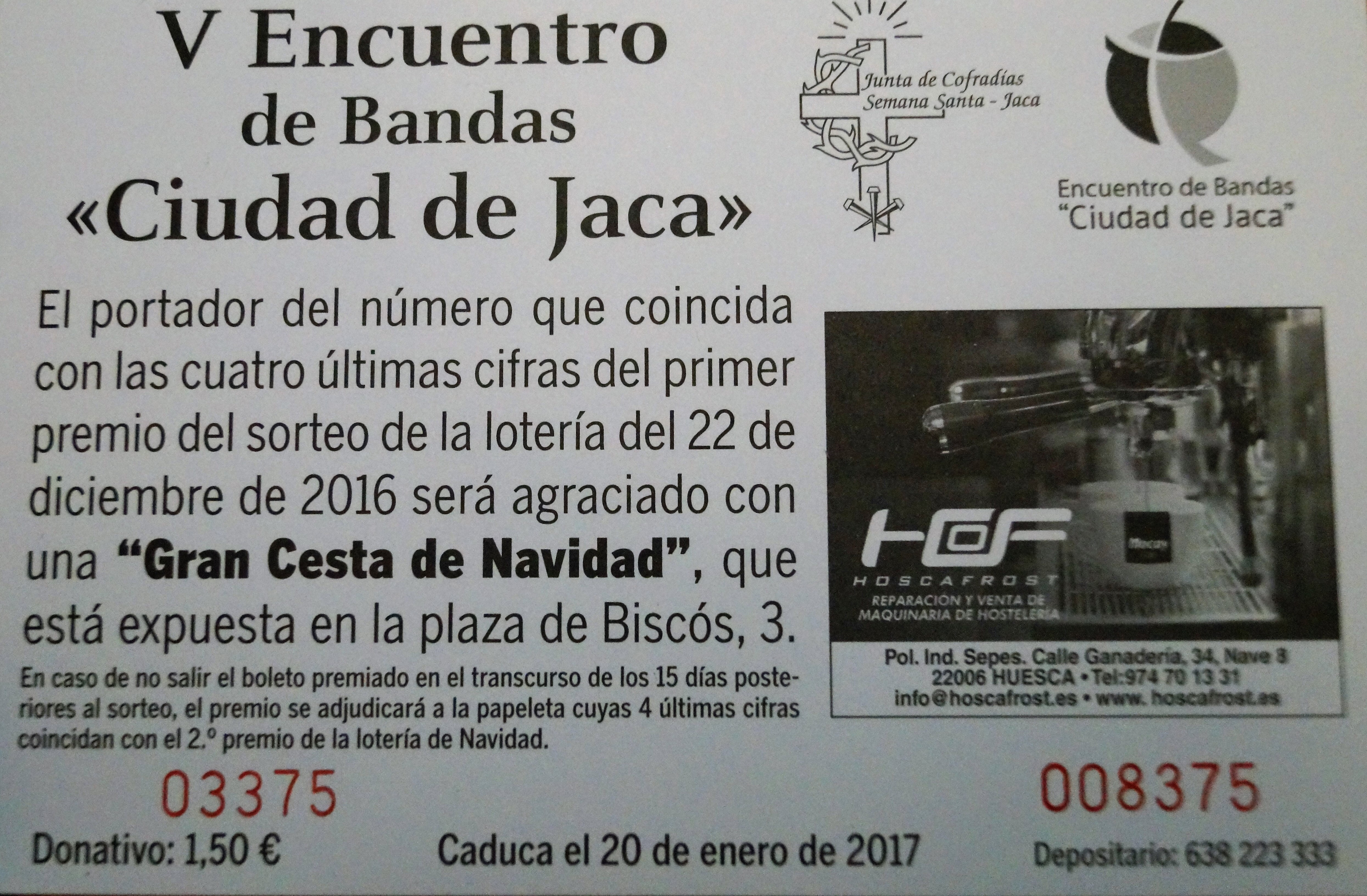 Manuel Lasala, de la Junta de Cofradías, explica que el dinero recaudado se destinará a la organización del V Encuentro de Bandas Ciudad de Jaca, que se celebrará el 18 de marzo de 2017 y en el que se esperan más de 1.500 personas, entre participantes y acompañantes. Se han enviado invitaciones a medio centenar de bandas de todos los puntos de España y, según la experiencia de años anteriores, se podrá contar, para esas fechas, con más de 30 agrupaciones. Las nueve cofradías de Semana Santa que existen en Jaca forman parte de la junta, que es la encargada de que nada falle en el buen desarrollo de  la Pasión jaquesa. Lasala ha querido agradecer su colaboración en la gran cesta de Navidad, así como en el Encuentro de Bandas y en el resto de actividades que se organizan desde la Junta de Cofradías, a las instituciones (principalmente al Ayuntamiento de la ciudad) y a todos los establecimientos que hacen posible que estas iniciativas puedan salir adelante.