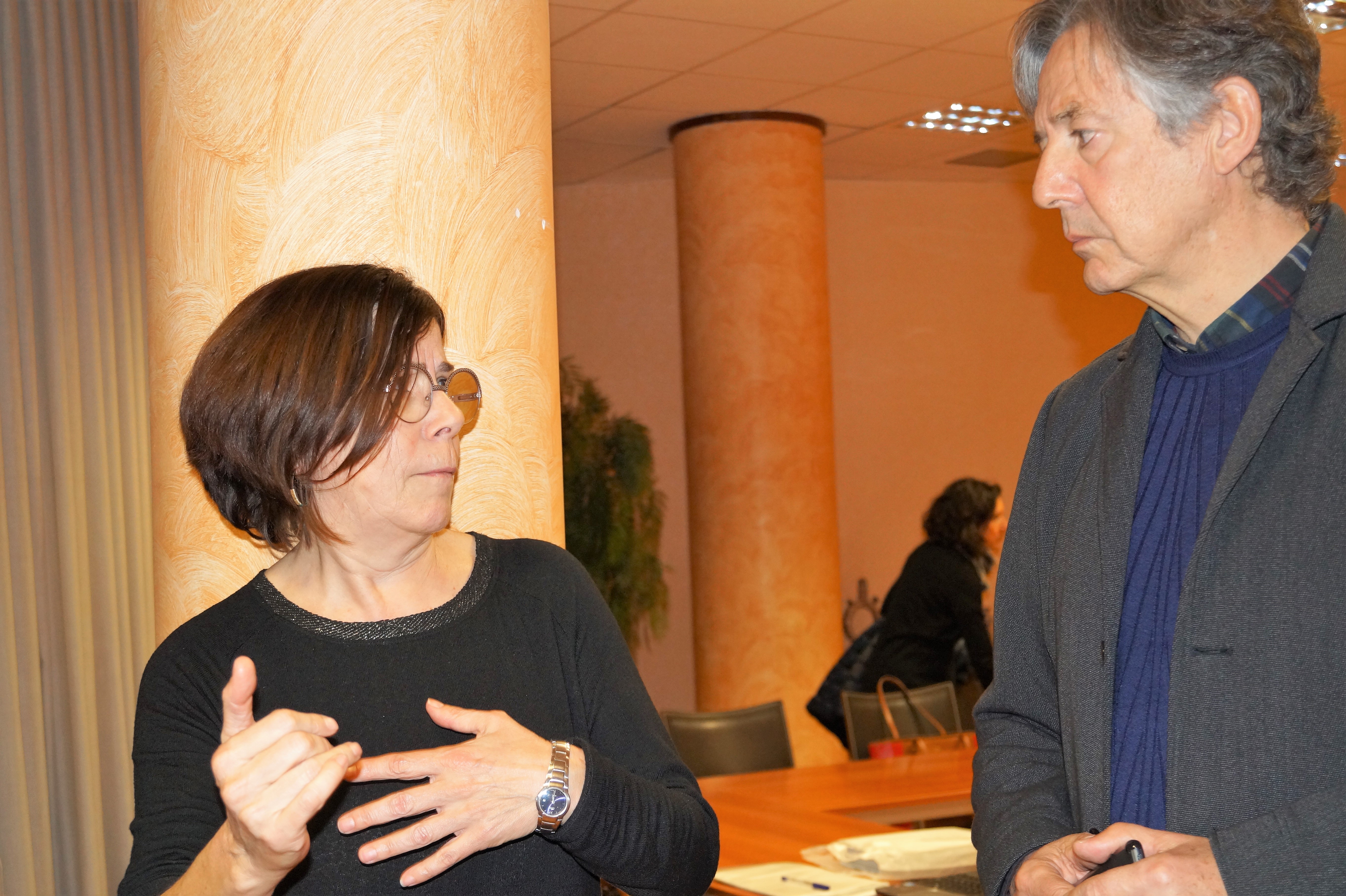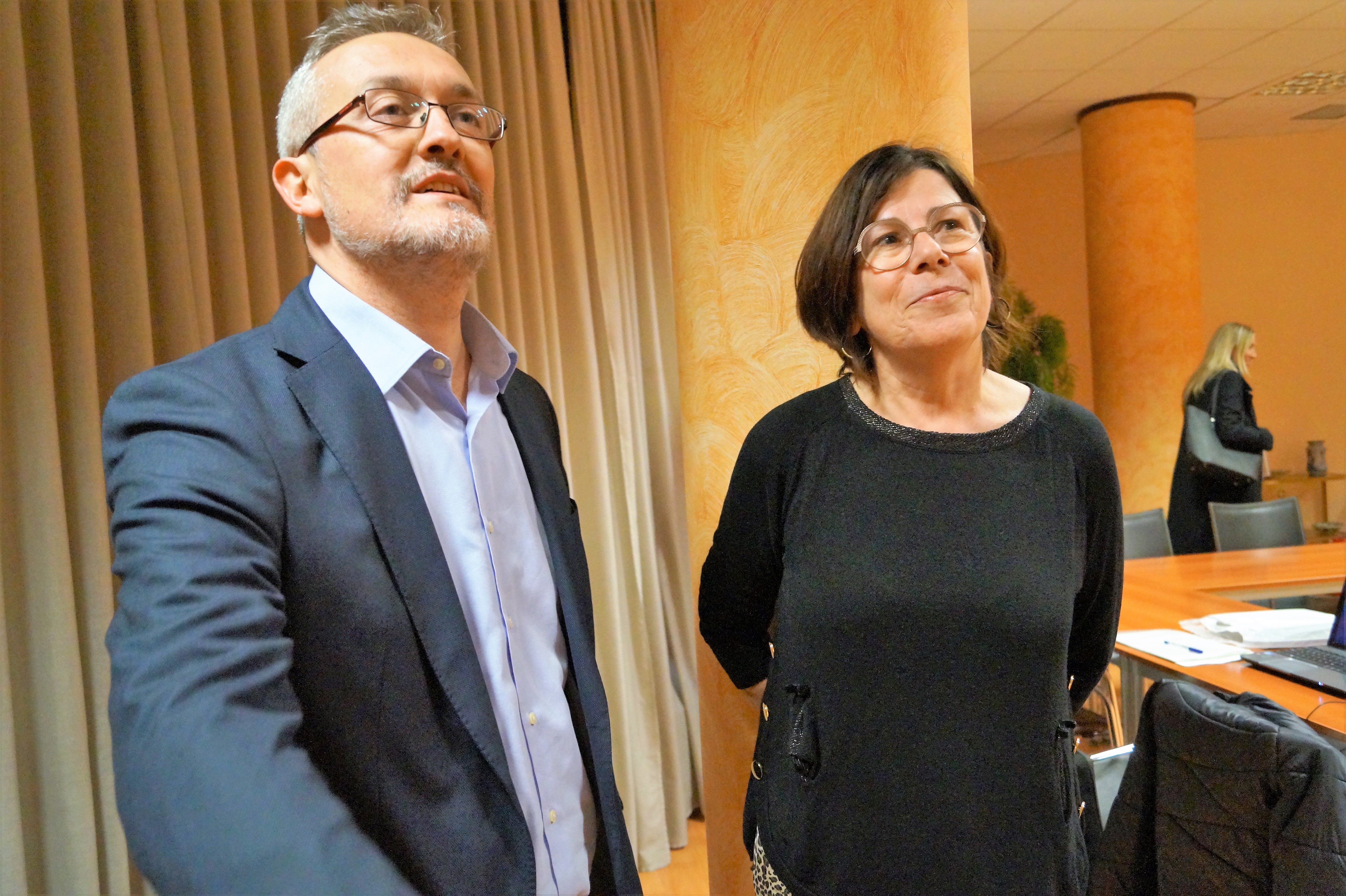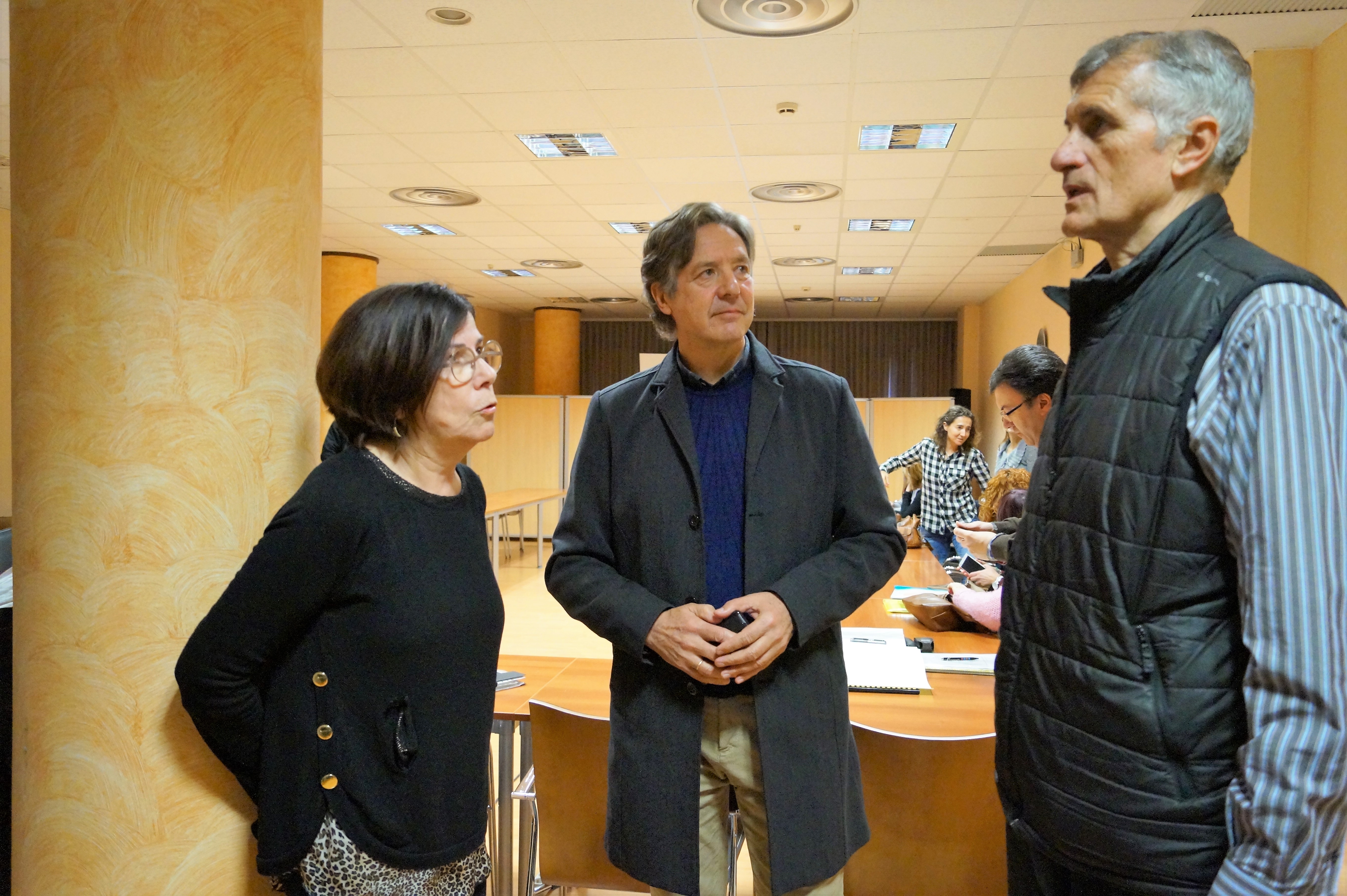 Martínez Urtasun y Ana Celia Hermosilla, miembro del Consejo Escolar de Aragón, acudían acompañadas al Palacio de Congresos por José Antonio Fau, jefe de la Oficina del Gobierno de Aragón en Jaca, a la reunión extraordinaria del Consejo Escolar Municipal convocada para dar a conocer el pacto.