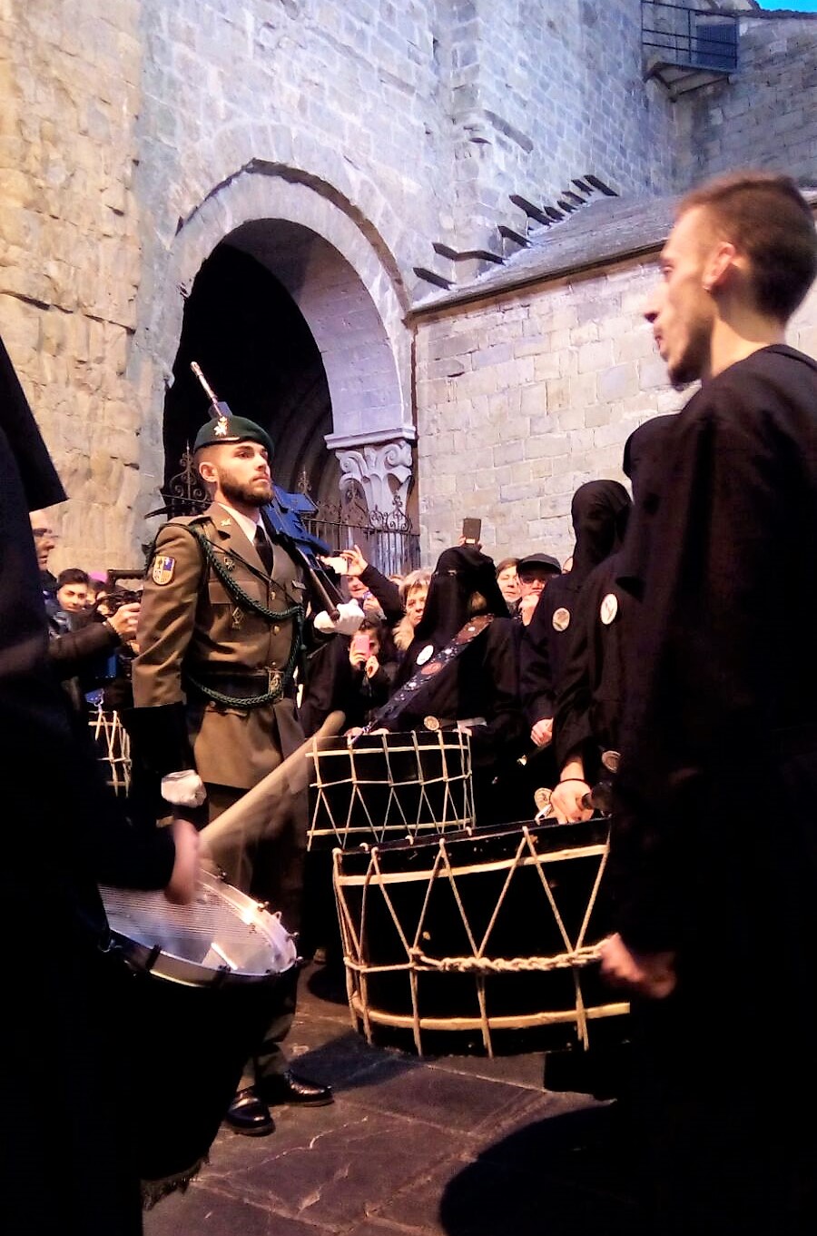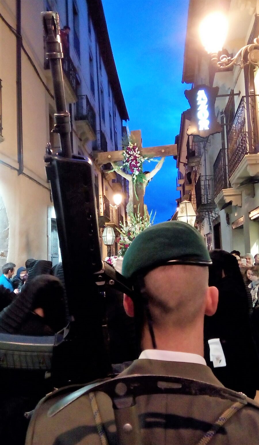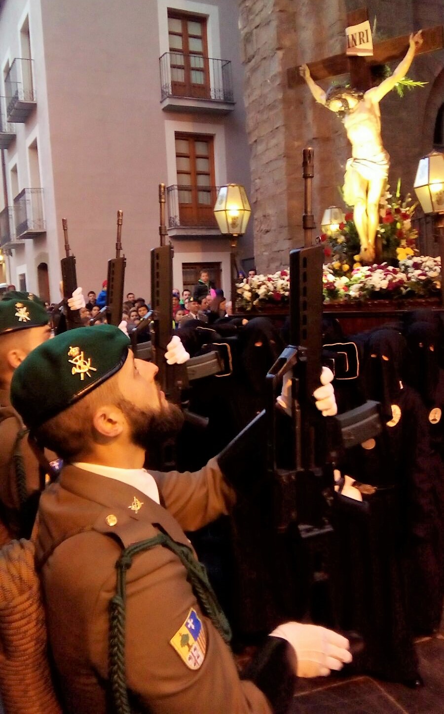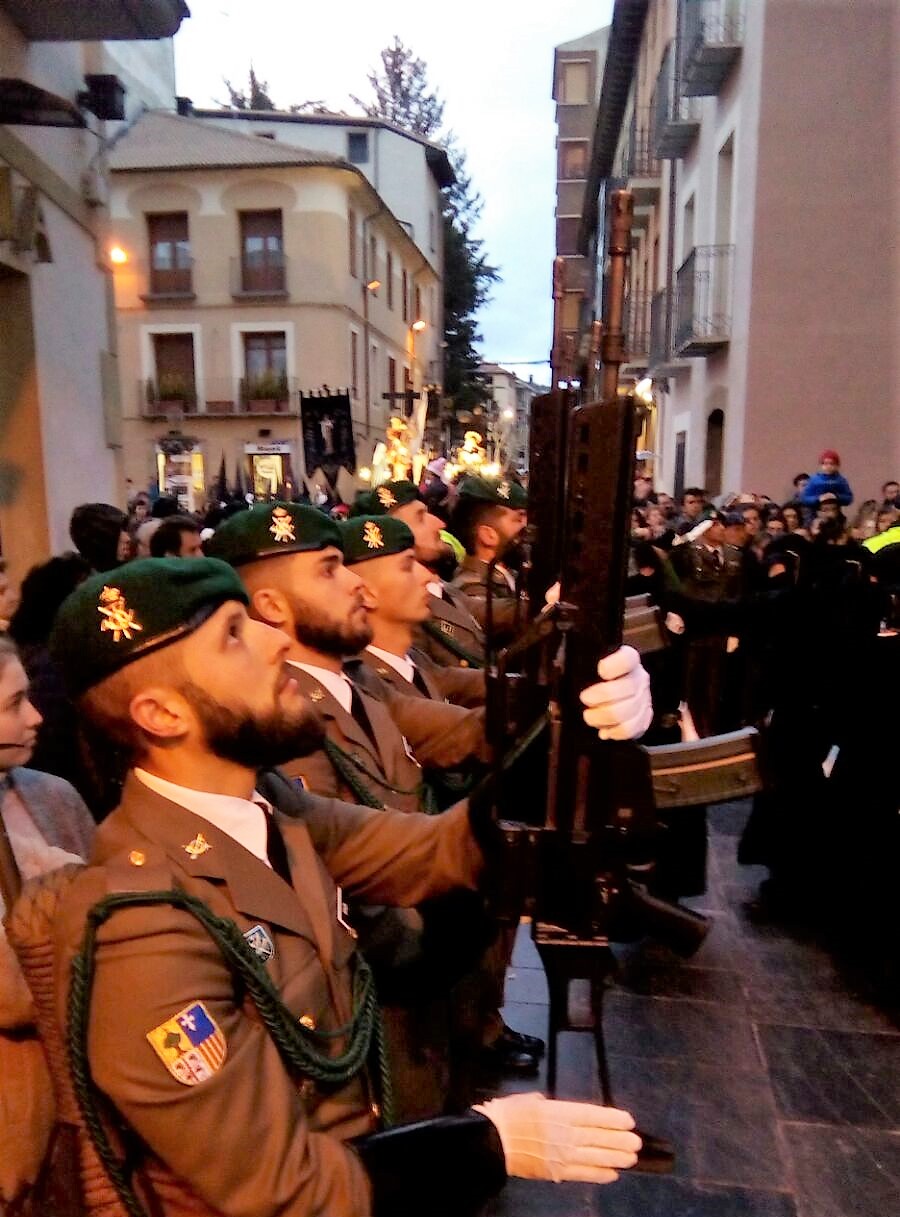Tradicionalmente, durante este desfile, resultan especialmente llamativos los movimientos que realizan los militares con sus armas (el fusil reglamentario, de unos cuatro kilos de peso). En primer lugar, a la puerta de la Catedral, presentan armas a la salida del paso, arropados por la Marcha Real que tocan las cornetas de la banda de la Hermandad de la Sangre de Cristo. Mientras esperan, mantienen la posición de firmes, y van con el fusil al hombro cuando escoltan al Cristo. A lo largo de todo el recorrido, se pueden observar en varias ocasiones los movimientos propios de la escuadra de gastadores, lo que resulta especialmente atractivo para el numeroso público que sigue esta procesión, una de las más solemnes y sobrias de la Semana Santa de Jaca.