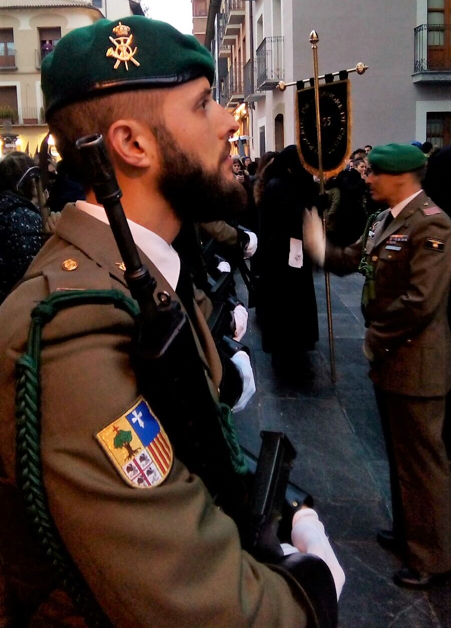 Aunque este 2018 se cumplen 50 años de la presencia militar oficial en las procesiones como hermano de honor, junto a La Sangre de Cristo, la guarnición ya salía mucho antes en la Semana Santa jaquesa junto a esta cofradía, fundada en 1742 (aunque vinculada a la Cofradía de la Veracruz, mucho más antigua, de 1555). A partir de que se le otorgara el título de Real Hermandad, a principios del siglo XIX, el Regimiento participaba ya regularmente en las procesiones «aportando banda de guerra, gastadores o unidad durante las procesiones», tal y como refleja el propio Ministerio de Defensa en la hemeroteca de su boletín.