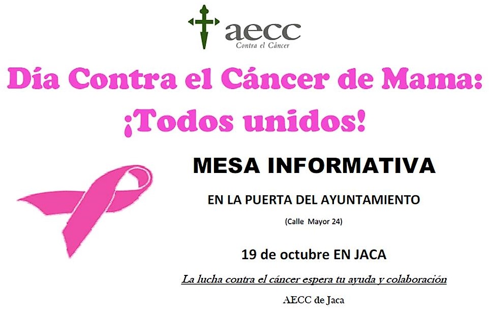 La AECC saldrá a la Calle Mayor de Jaca el 19 de octubre para informar sobre los riesgos y la prevención, así como la ayuda que la asociación puede prestar tanto a los enfermos de cáncer como a sus familias. También se venderán distintos productos para recaudar fondos para la investigación contra la enfermedad. Está previsto que un gran lazo rosa, como otras veces, adorne la fachada de la Casa Consistorial.