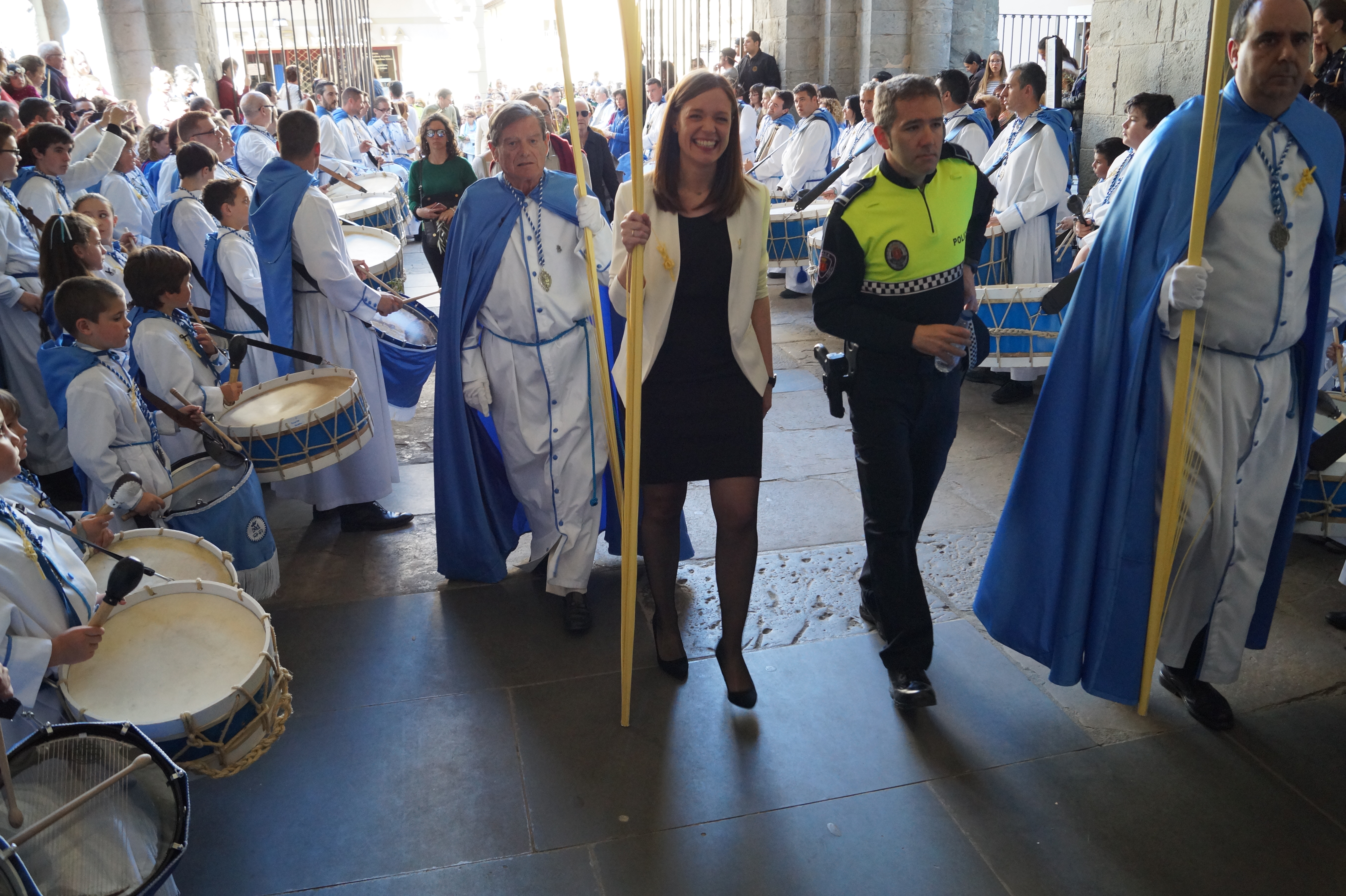 Abría los actos la bendición de las palmas y los ramos, con el paso de La Burreta en primera línea arropado por la multitud. La procesión, encabezada por las autoridades civiles y militares, como manda el protocolo, se abría paso hasta la Catedral, donde La Burreta era recibida a ritmo de jota por los miembros del Grupo Uruel. Este año, la actuación del grupo folclórico era acompañada por el sonido de los tambores de Miguel Ángel Auseré y Ángel Otín. La entrada en la seo jaquesa resultaba impresionante, y la emoción entre los miembros de la banda de tambores y bombos contagiaba al público presente, que agradecía sus interpretaciones y su entrega con calurosos aplausos.