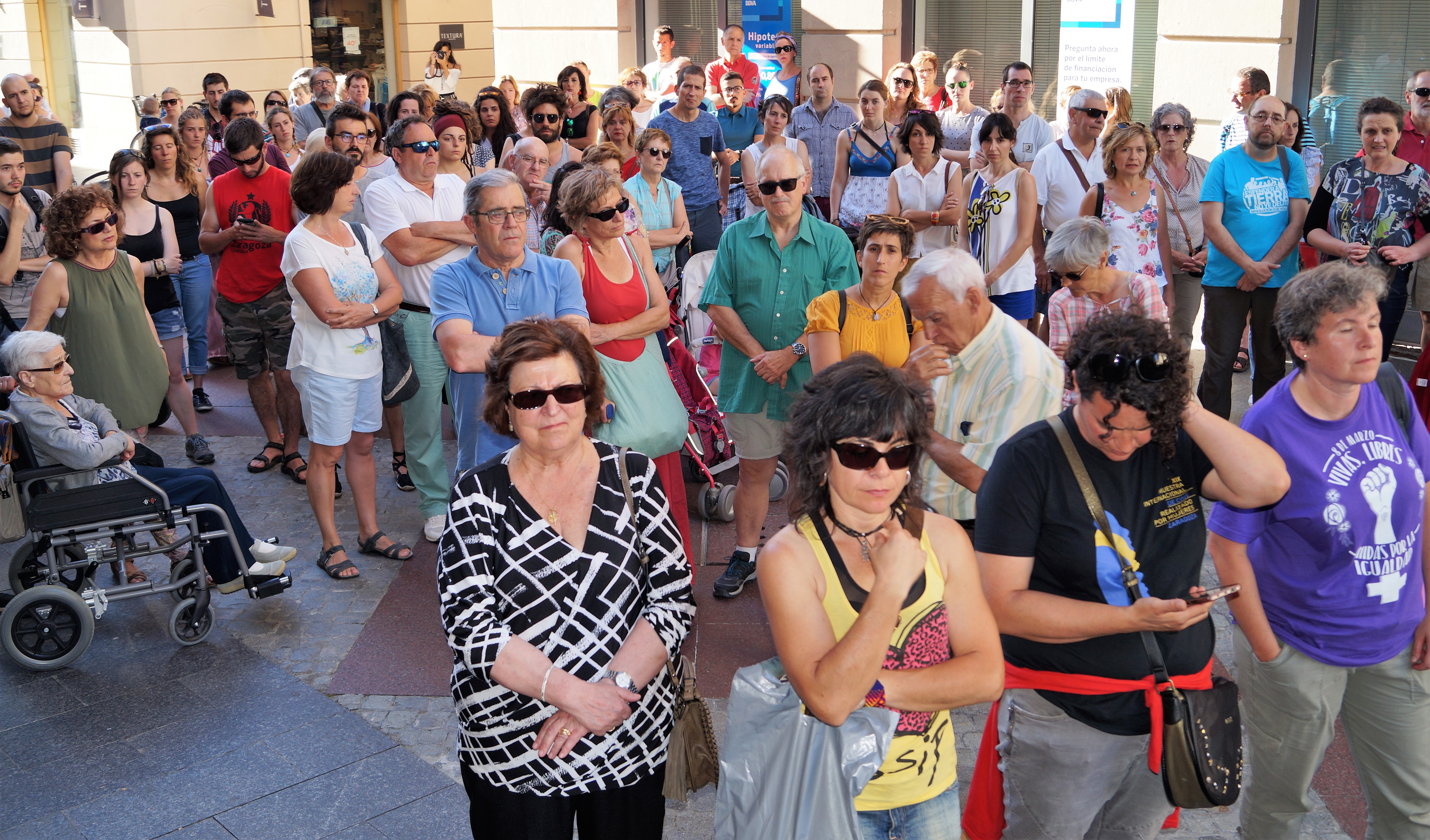 La Plataforma 8M y otros colectivos feministas y asociaciones de la Jacetania y el Alto Gállego convocaban este viernes en Jaca y en Sabiñánigo una concentración en contra de la decisión judicial que ha dejado en libertad a La Manada, los cinco jóvenes que se encontraban en prisión preventiva condenados a 9 años de prisión por abusar sexualmente de una joven de 18 años en los sanfermines de 2016.