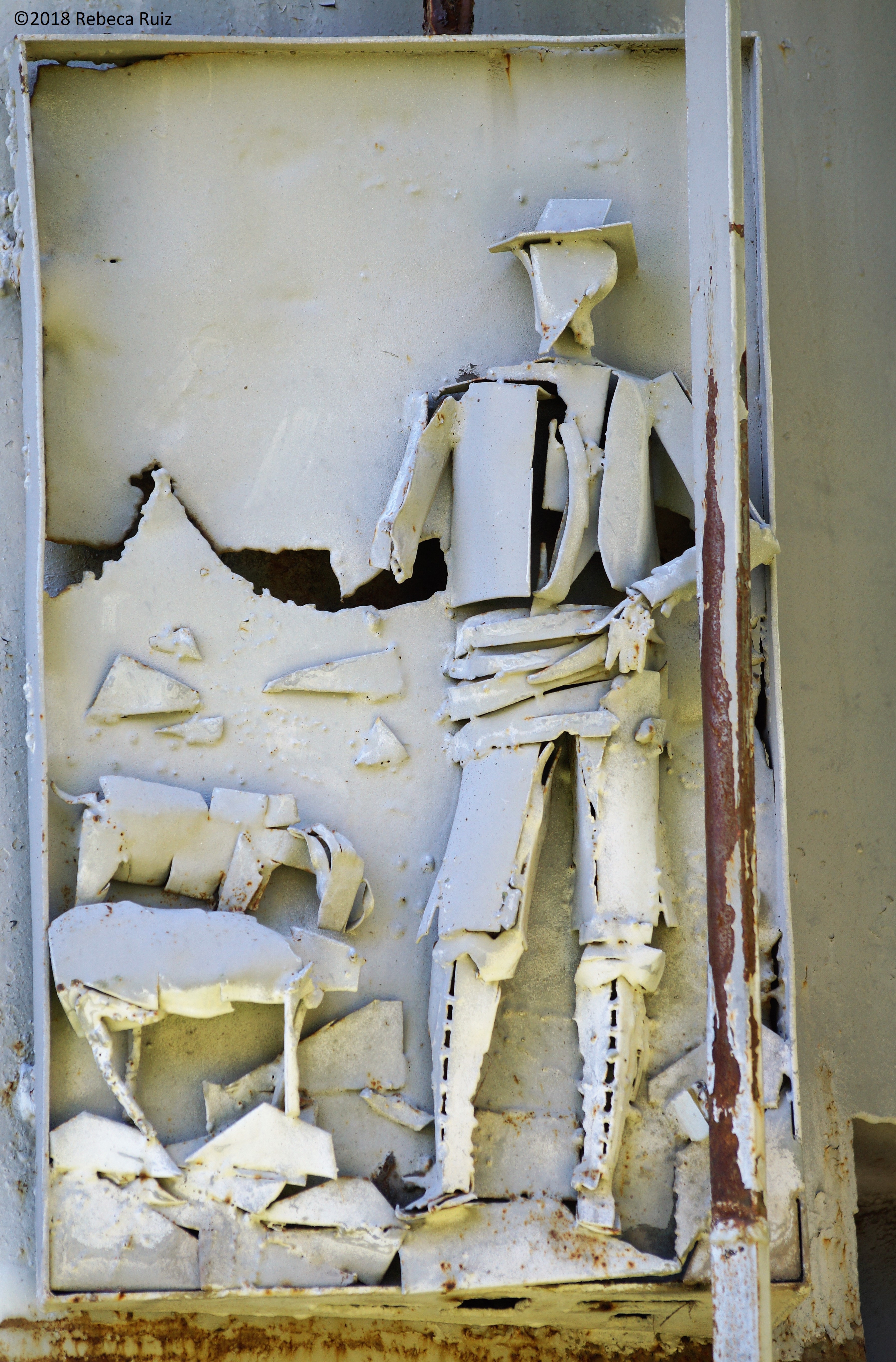 El monumento es una escultura de siete metros de altura (nueve, contando el pedestal original) y dos toneladas y media de peso. Es una figura alegórica que recuerda a una especie de peregrino que muestra en sus manos el Claustro de San Juan de la Peña. Precisamente, son sus manos uno de los elementos en los que este deterioro se hace más visible, totalmente oxidadas y cubiertas de herrumbre. Paradójicamente, cabe recordar que una de sus características es que no tiene pies, en referencia a su carácter de espiritualidad y trascendencia. Sin embargo, cuando está a punto de cumplirse el 50 aniversario de su instalación en Jaca, la imagen que ofrece esta imponente obra es totalmente la opuesta.