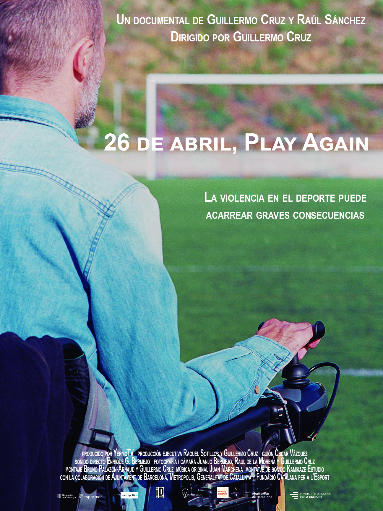 26 de abril. Play Again acaba de presentarse en Barcelona. El documental, de 70 minutos, forma parte del proyecto emprendido por Raúl Sánchez, un futbolista que terminó en una silla de ruedas tras ser agredido por un rival, y próximamente llegará al público en general.