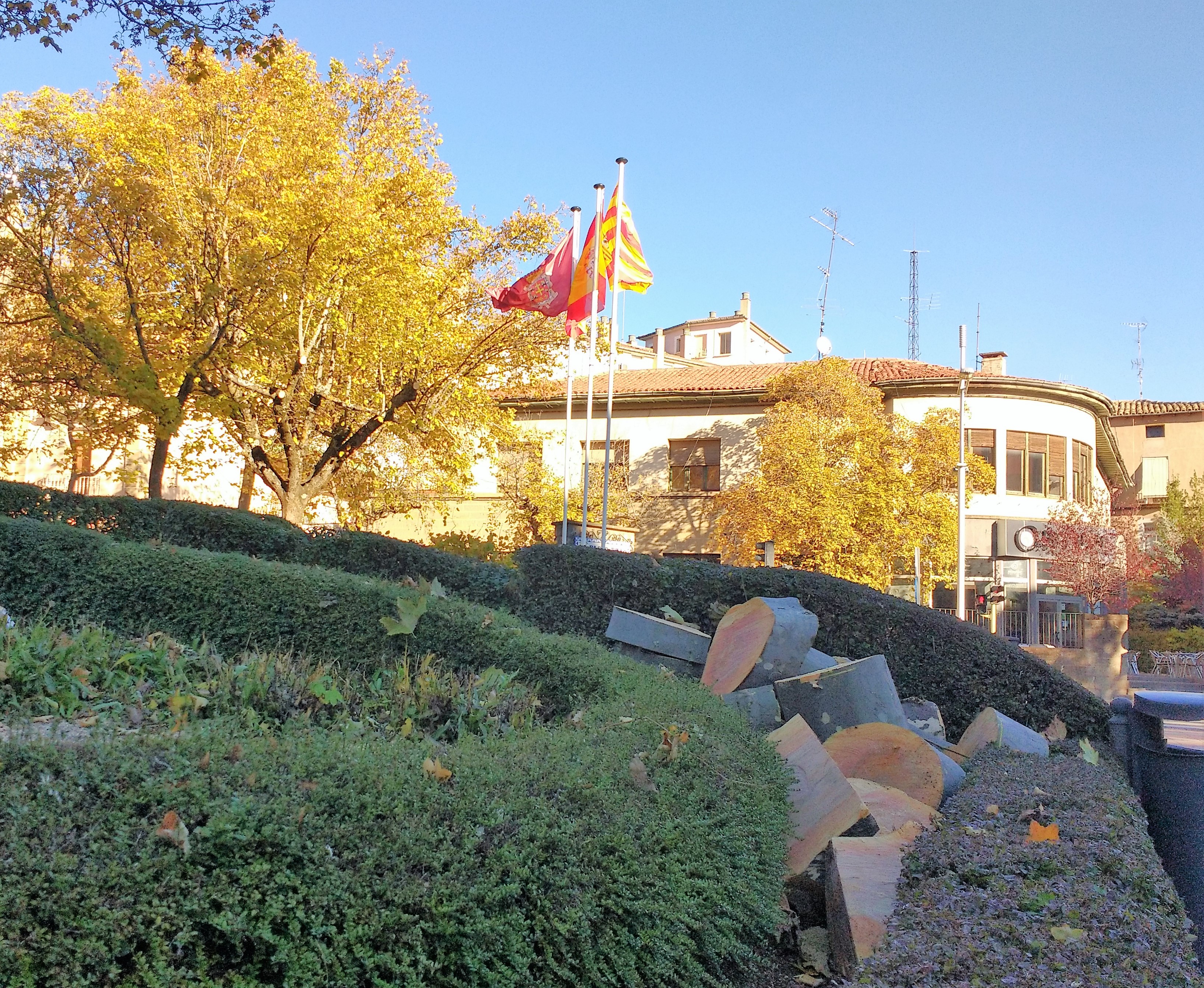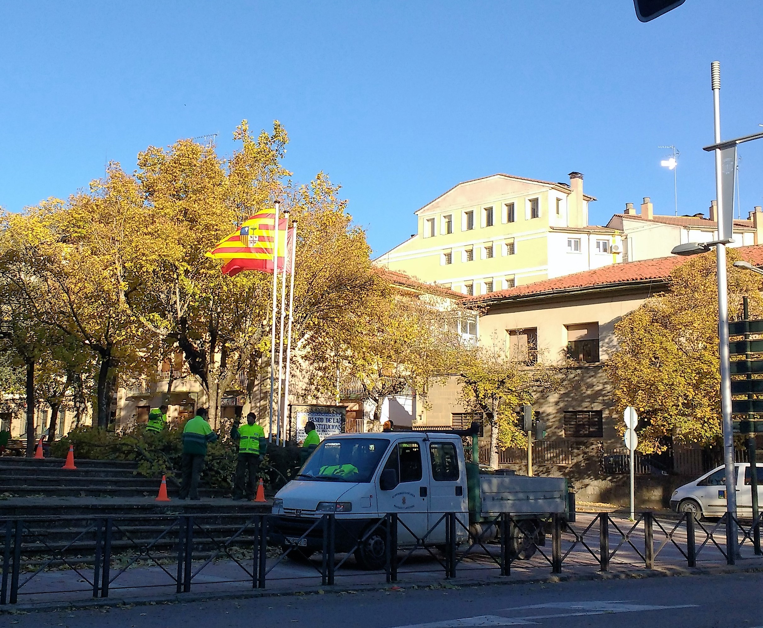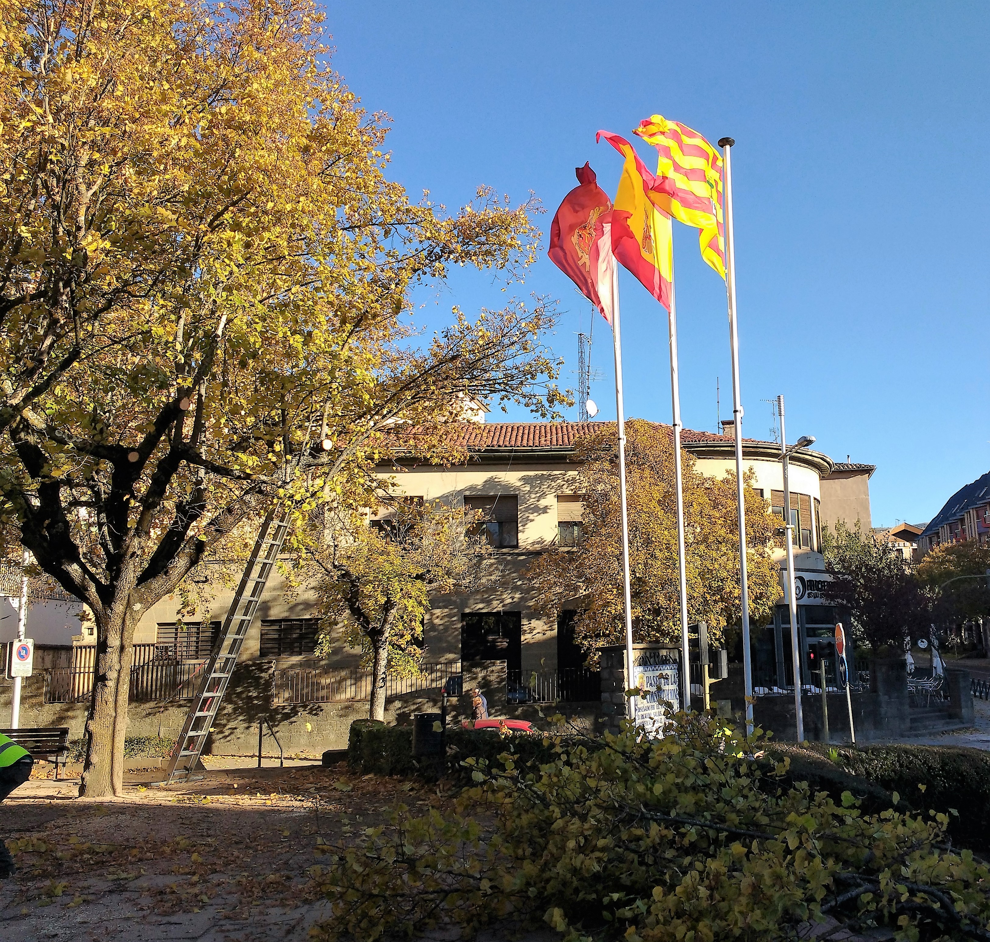Para la colocación de esa nueva base y los mástiles en su lugar, se ha aprovechado y se ha podado un plátano próximo y que ya hacía tiempo que necesitaba este cuidado porque las hojas y ramas ya caían, talándose los árboles que custodiaban la entrada principal del Paseo de la Constitución. Las banderas son nuevas y se han confeccionado en un taller especializado que se dedica a elaborar estos artículos.